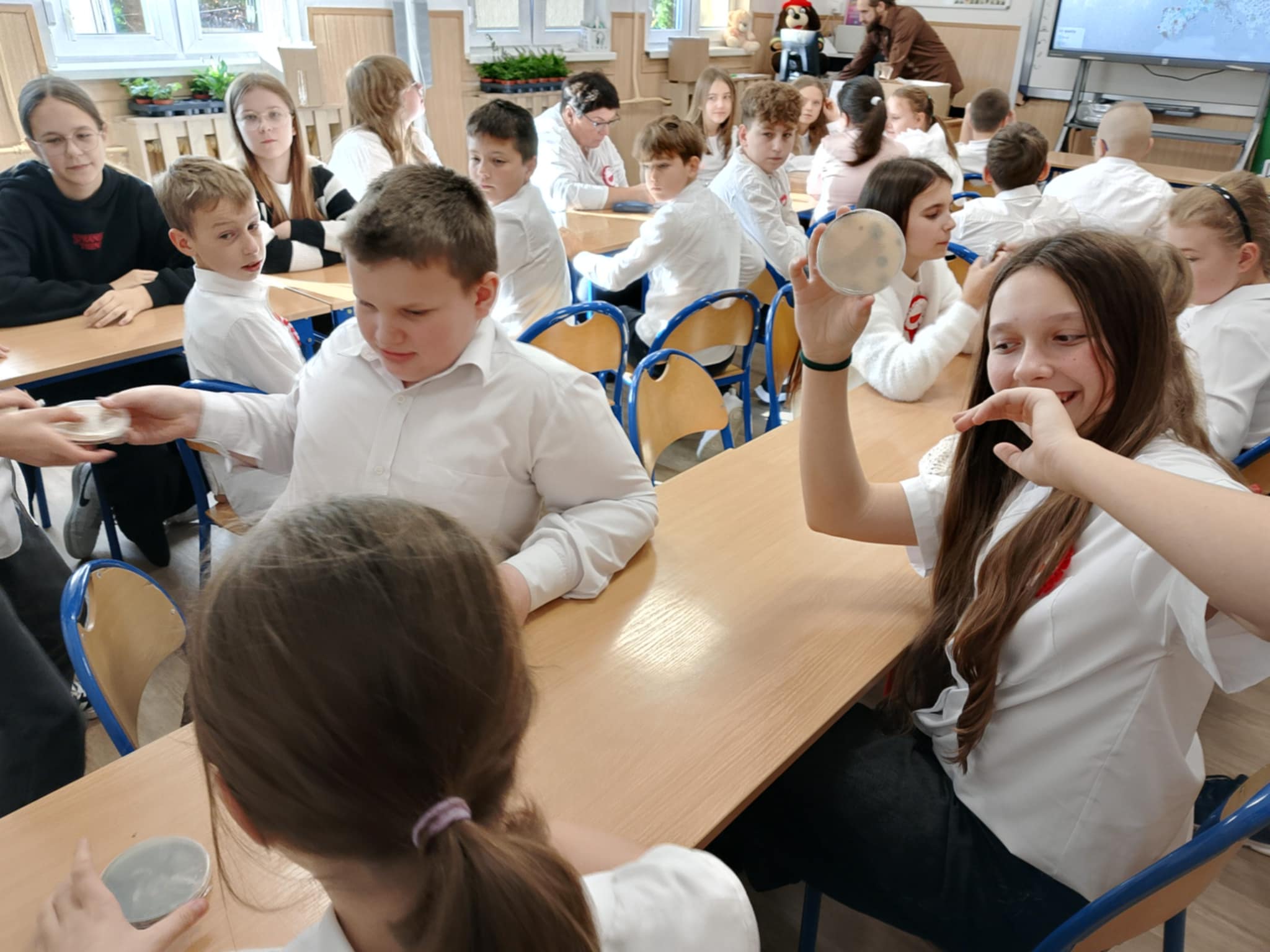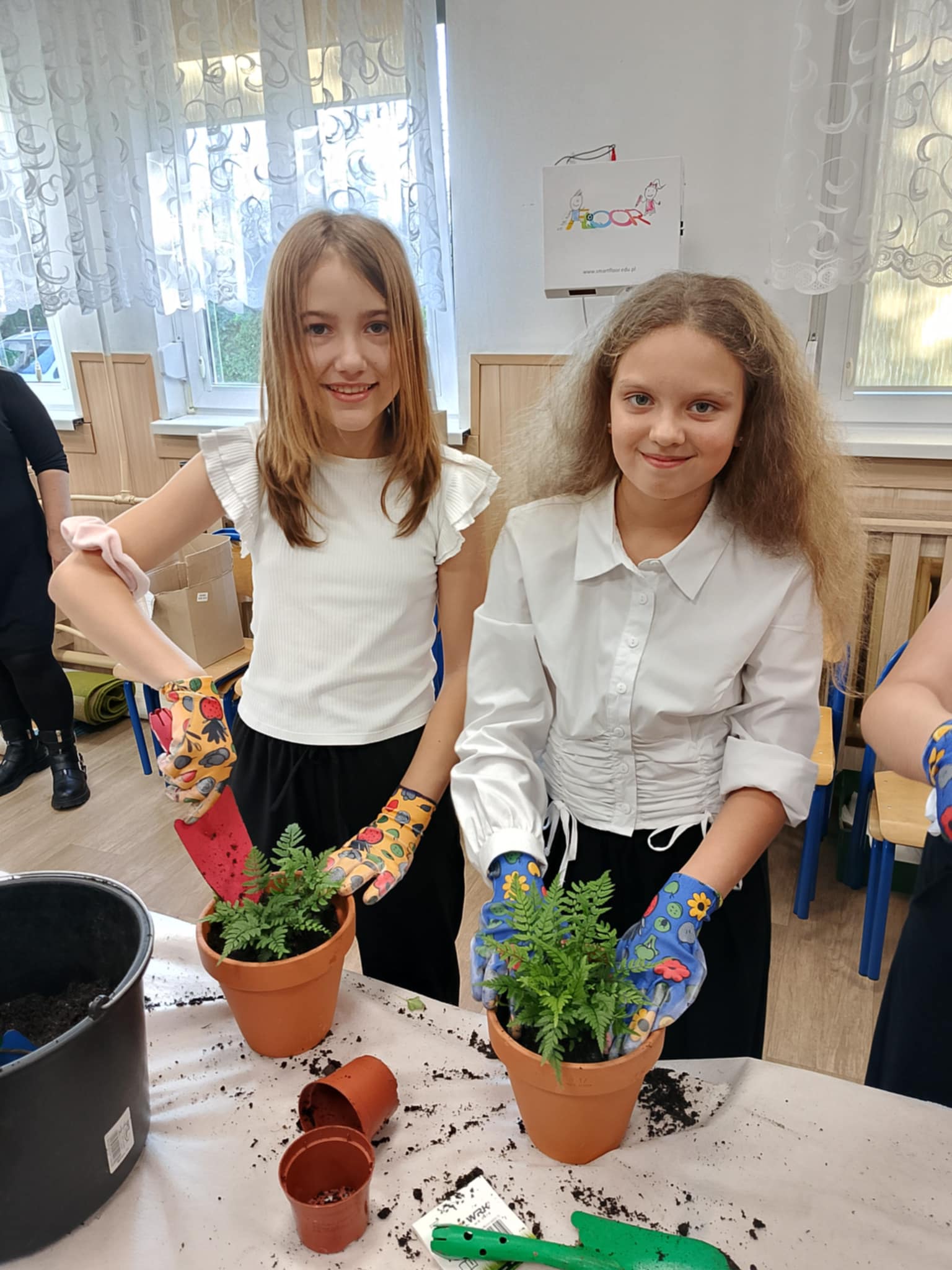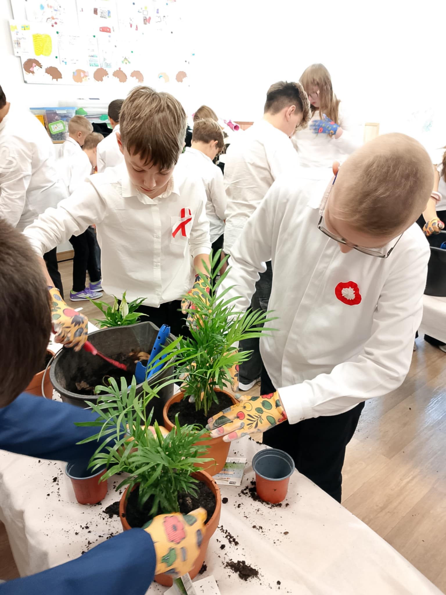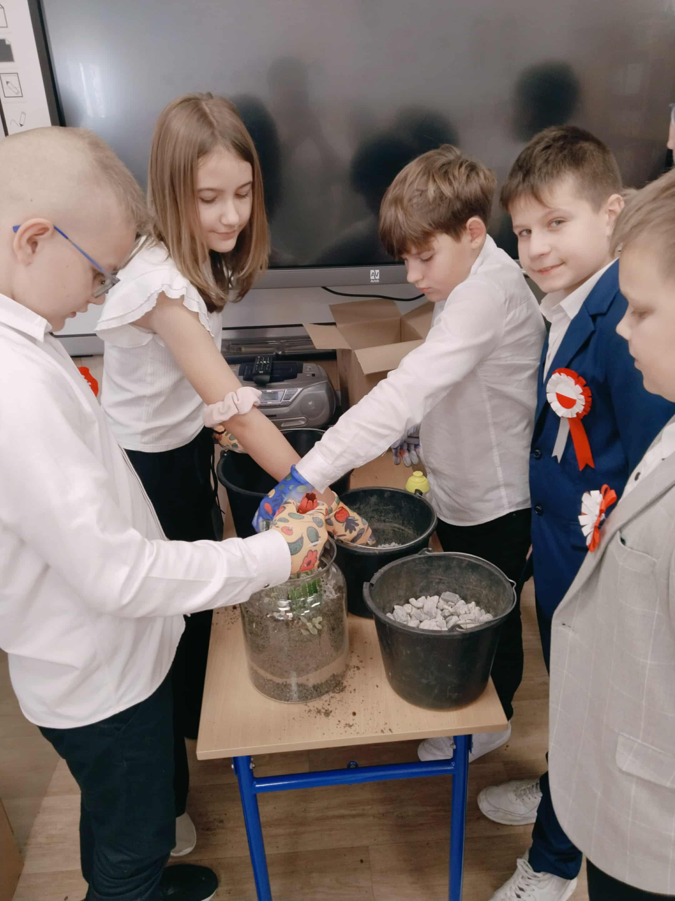Po części teoretycznej uczniowie wzięli udział w warsztatach praktycznych. Zadaniem uczestników było posadzenie roślin w doniczkach – gatunków, które mają pozytywny wpływ na zdrowie i poprawiają jakość powietrza w pomieszczeniach. Dzięki temu każdy uczeń wykonał mały „zielony filtr”, który będzie przypominał o znaczeniu troski o środowisko.