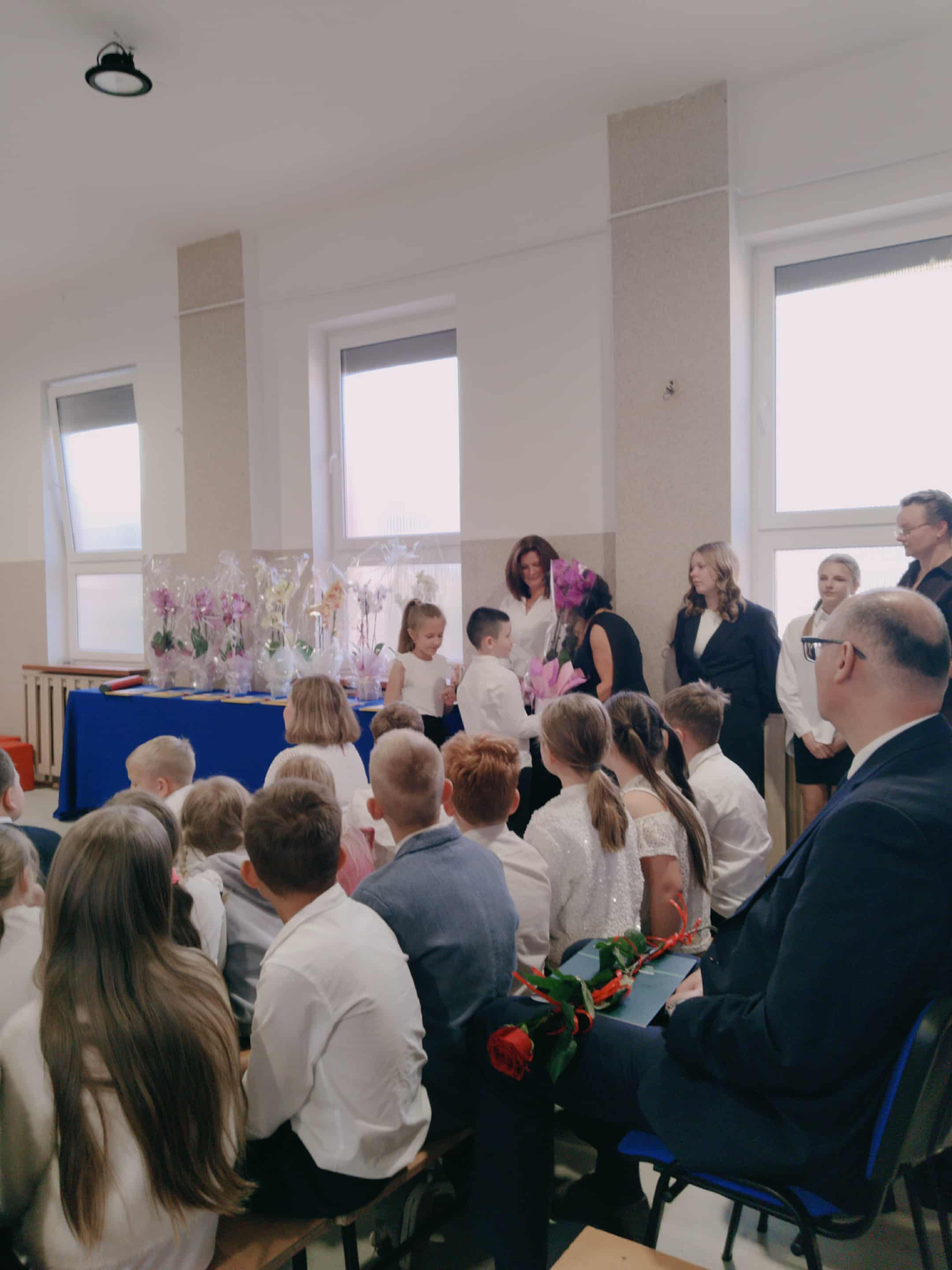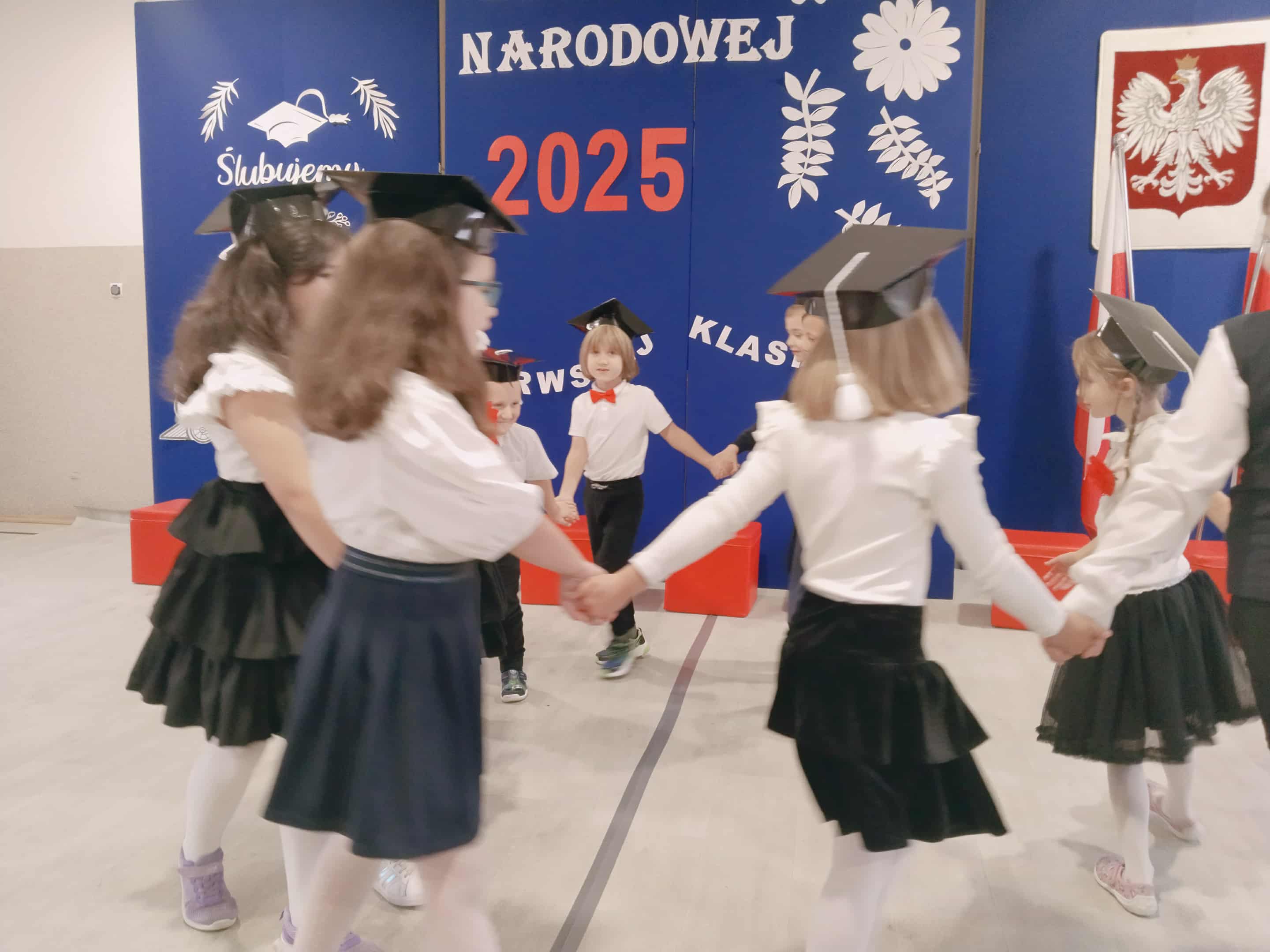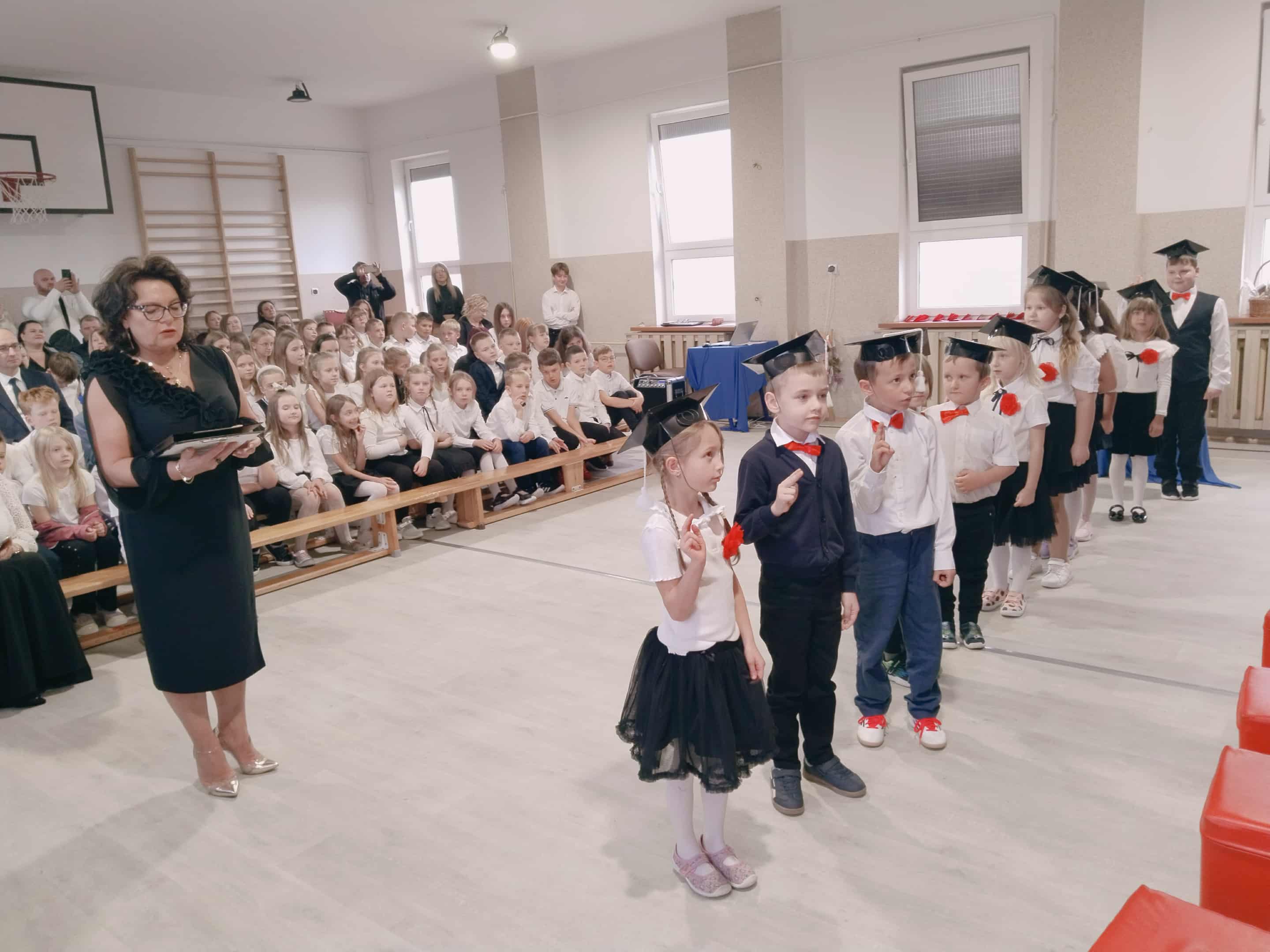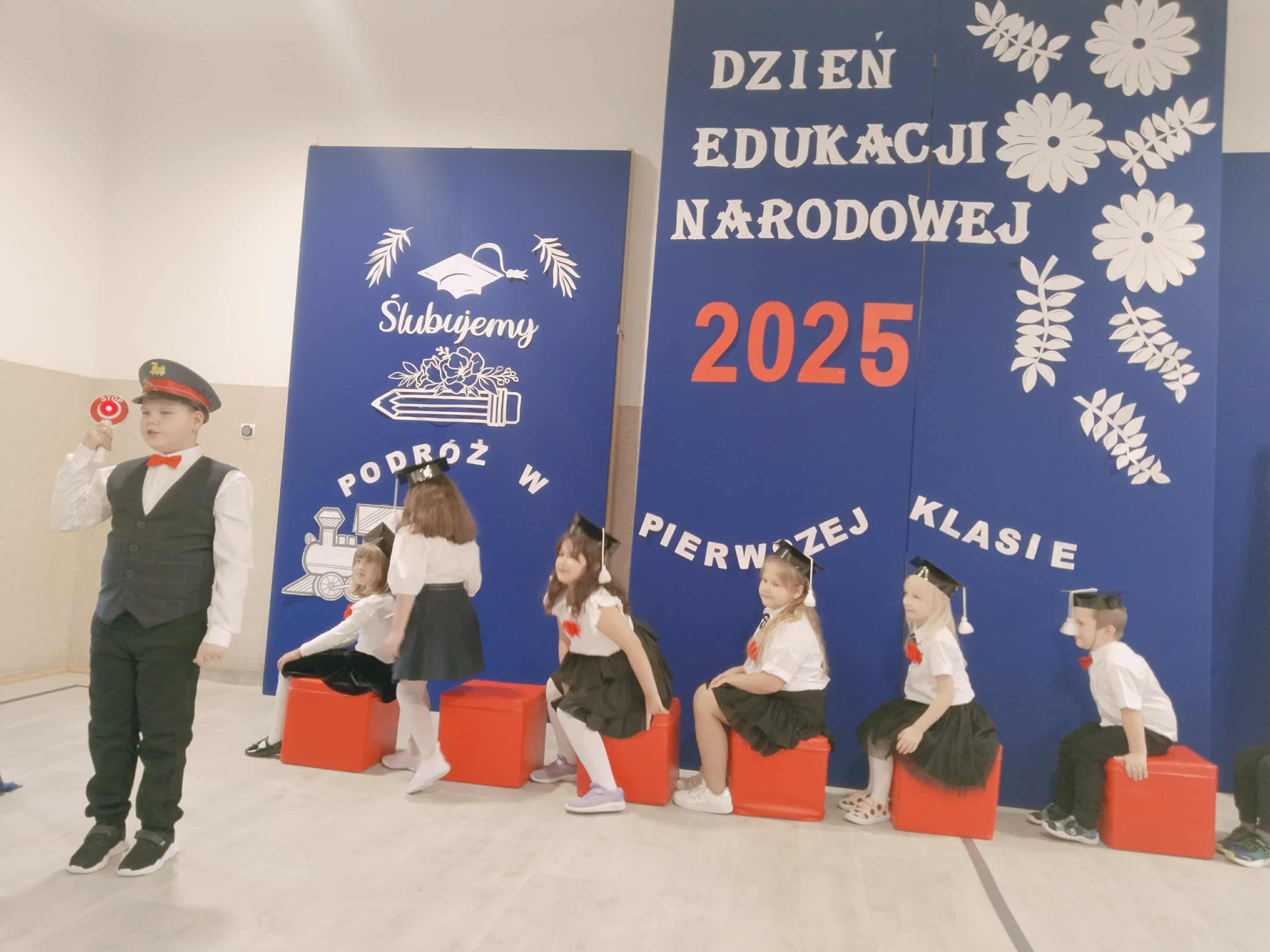 Uroczystość rozpoczęła się barwnym występem uczniów klasy I - pod bacznym okiem pań - Grażyny Borek i Małgorzaty Baldiszak, którzy zaprosili nas w niezwykłą podróż edukacyjnym pociągiem. Pociąg zatrzymywał się na stacjach: polonistycznej, przyrodniczej, matematycznej, artystycznej i wielu innych, a na każdej z nich dzieci poznawały coś ważnego i ciekawego. Ich występ był pełen entuzjazmu, kreatywności i dziecięcej radości odkrywania świata.