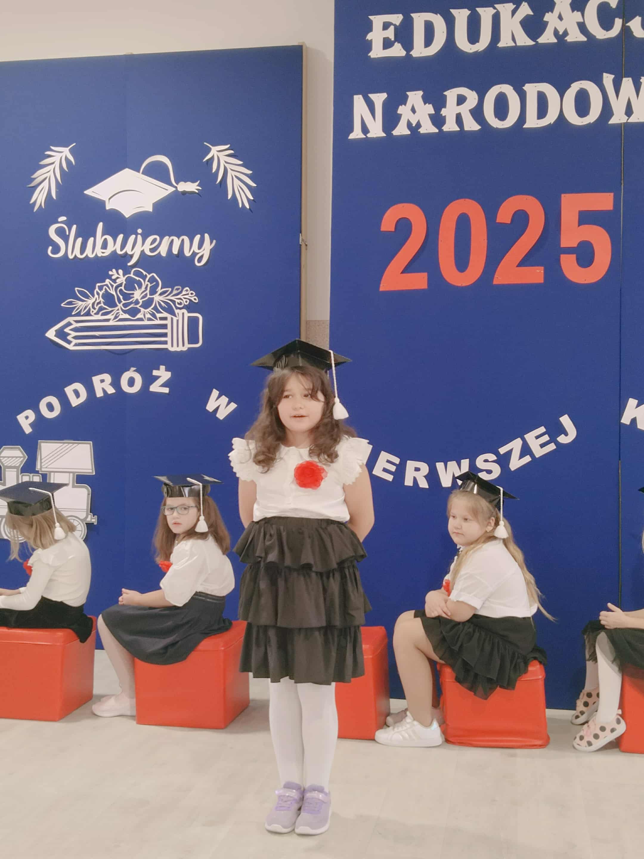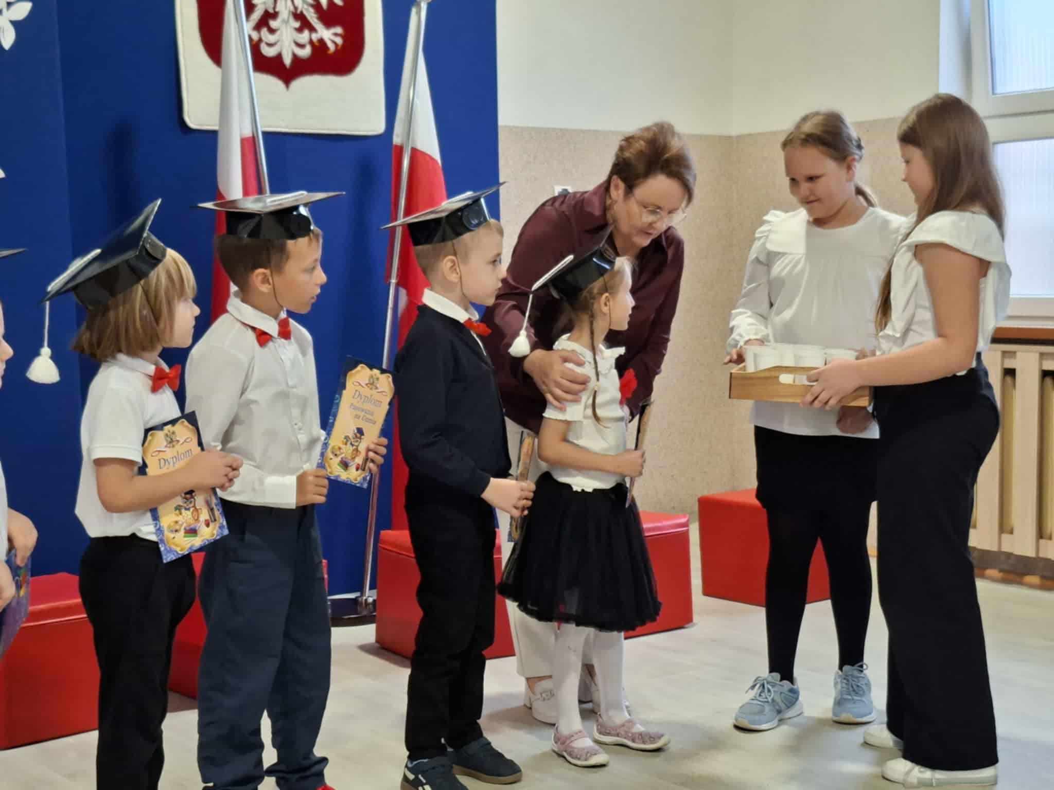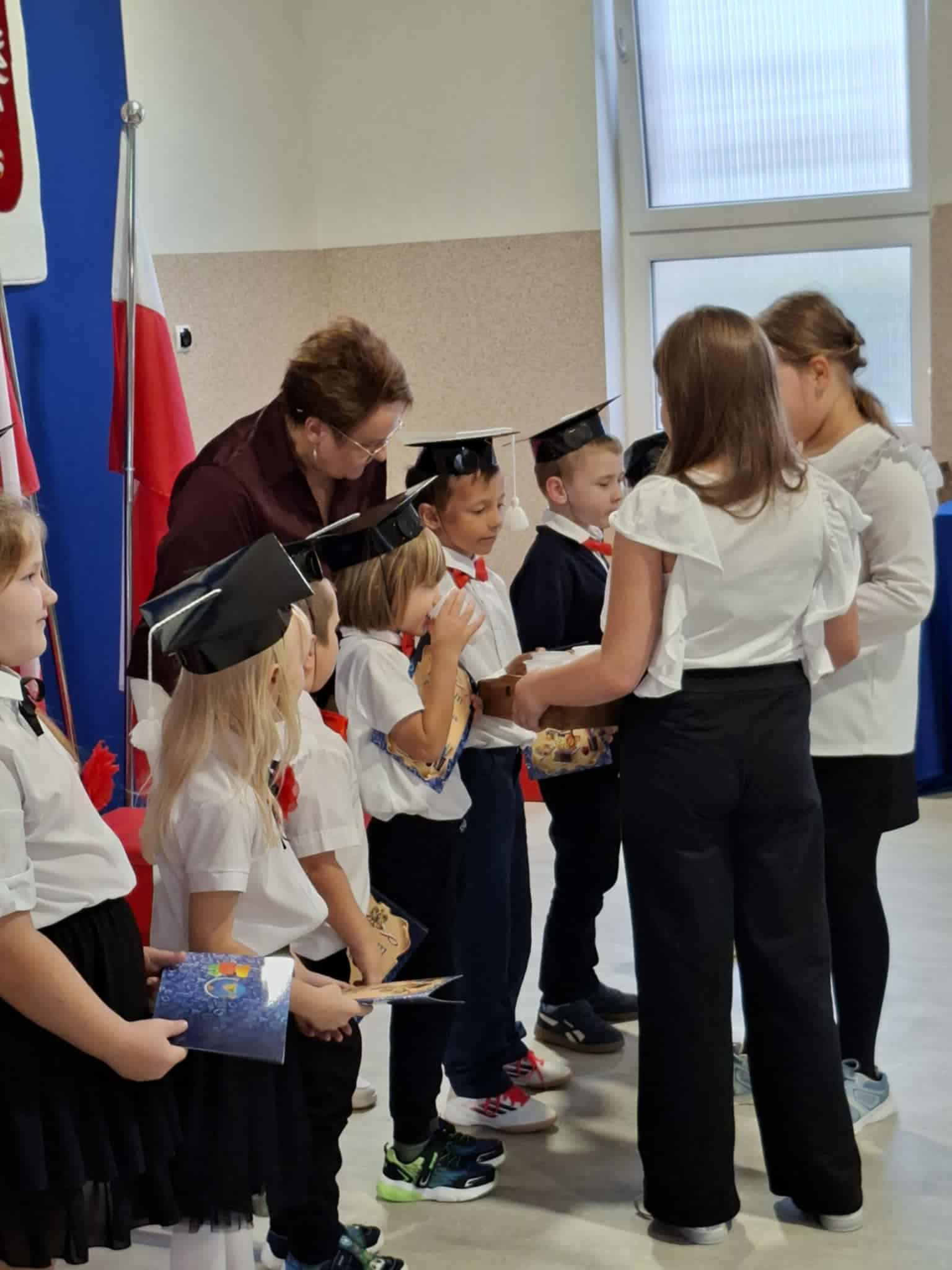 Uroczystość rozpoczęła się barwnym występem uczniów klasy I - pod bacznym okiem pań - Grażyny Borek i Małgorzaty Baldiszak, którzy zaprosili nas w niezwykłą podróż edukacyjnym pociągiem. Pociąg zatrzymywał się na stacjach: polonistycznej, przyrodniczej, matematycznej, artystycznej i wielu innych, a na każdej z nich dzieci poznawały coś ważnego i ciekawego. Ich występ był pełen entuzjazmu, kreatywności i dziecięcej radości odkrywania świata.