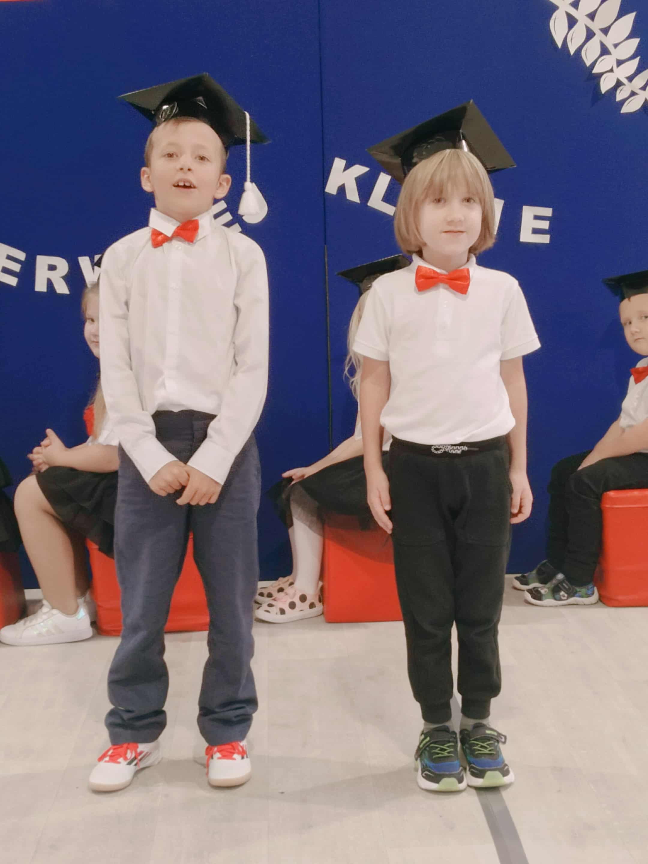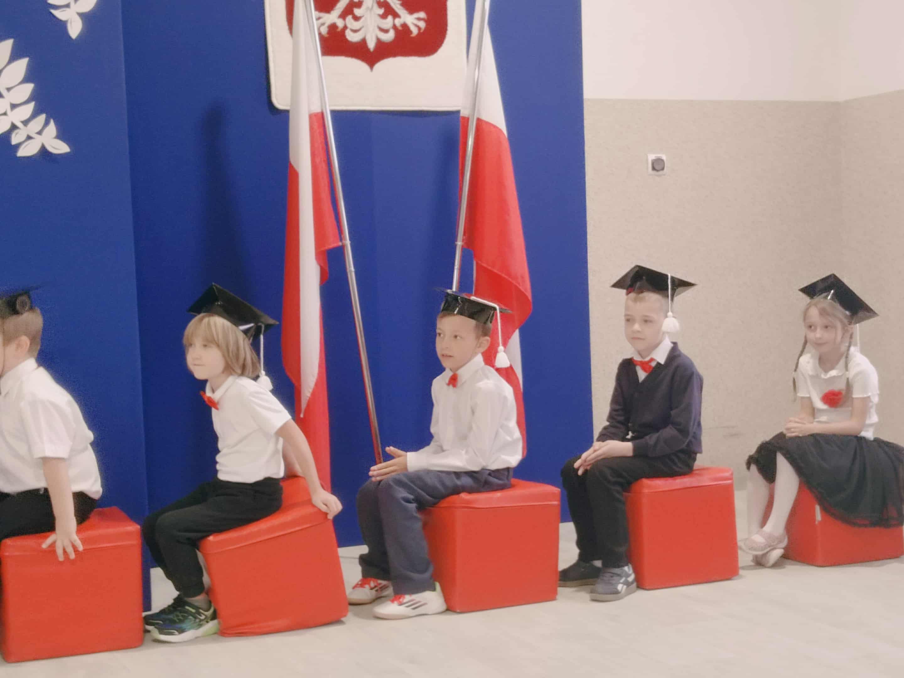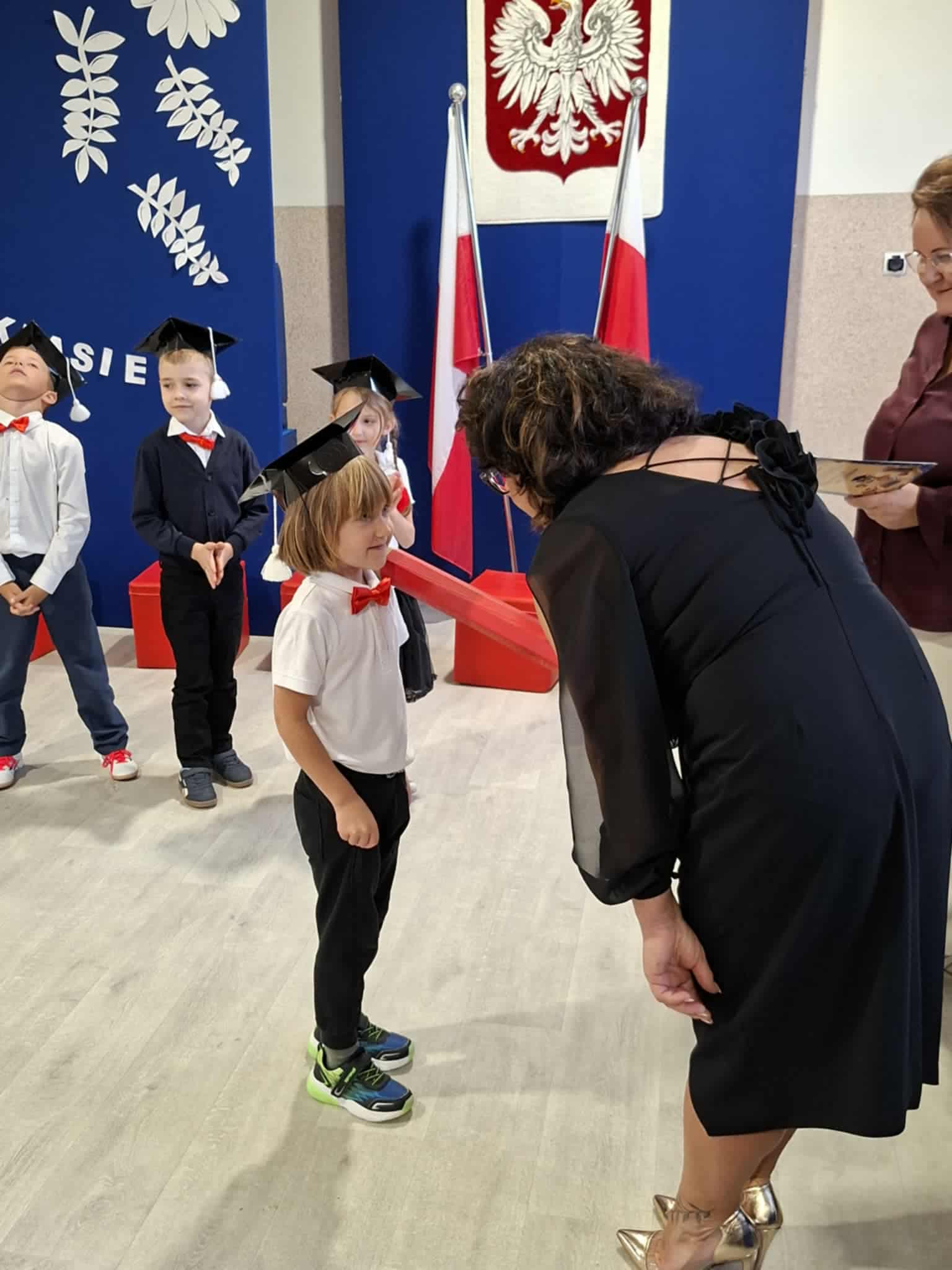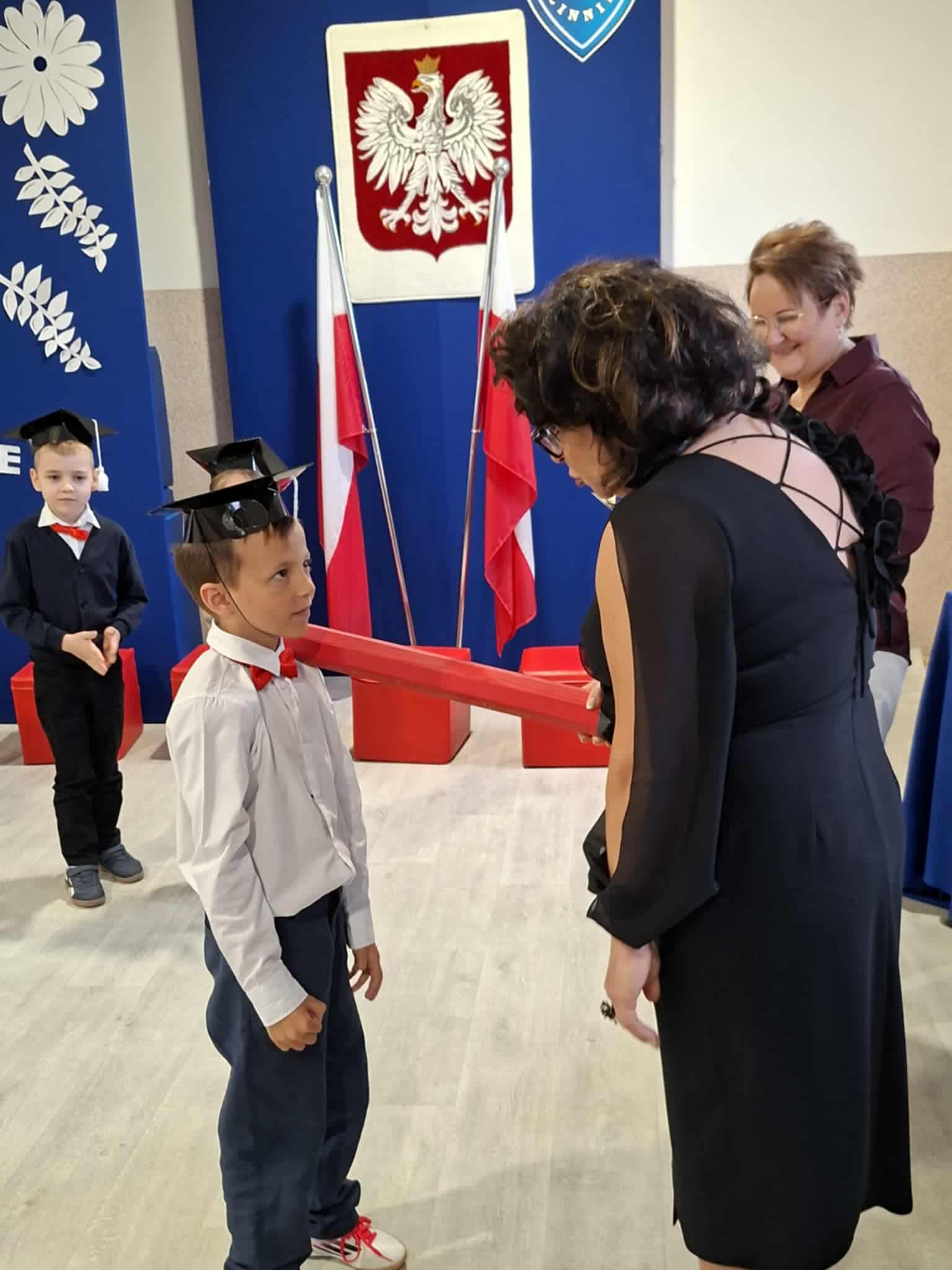 Uroczystość rozpoczęła się barwnym występem uczniów klasy I - pod bacznym okiem pań - Grażyny Borek i Małgorzaty Baldiszak, którzy zaprosili nas w niezwykłą podróż edukacyjnym pociągiem. Pociąg zatrzymywał się na stacjach: polonistycznej, przyrodniczej, matematycznej, artystycznej i wielu innych, a na każdej z nich dzieci poznawały coś ważnego i ciekawego. Ich występ był pełen entuzjazmu, kreatywności i dziecięcej radości odkrywania świata.