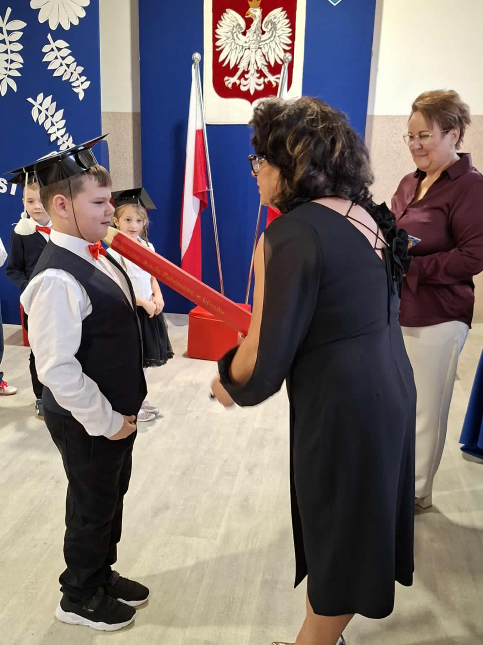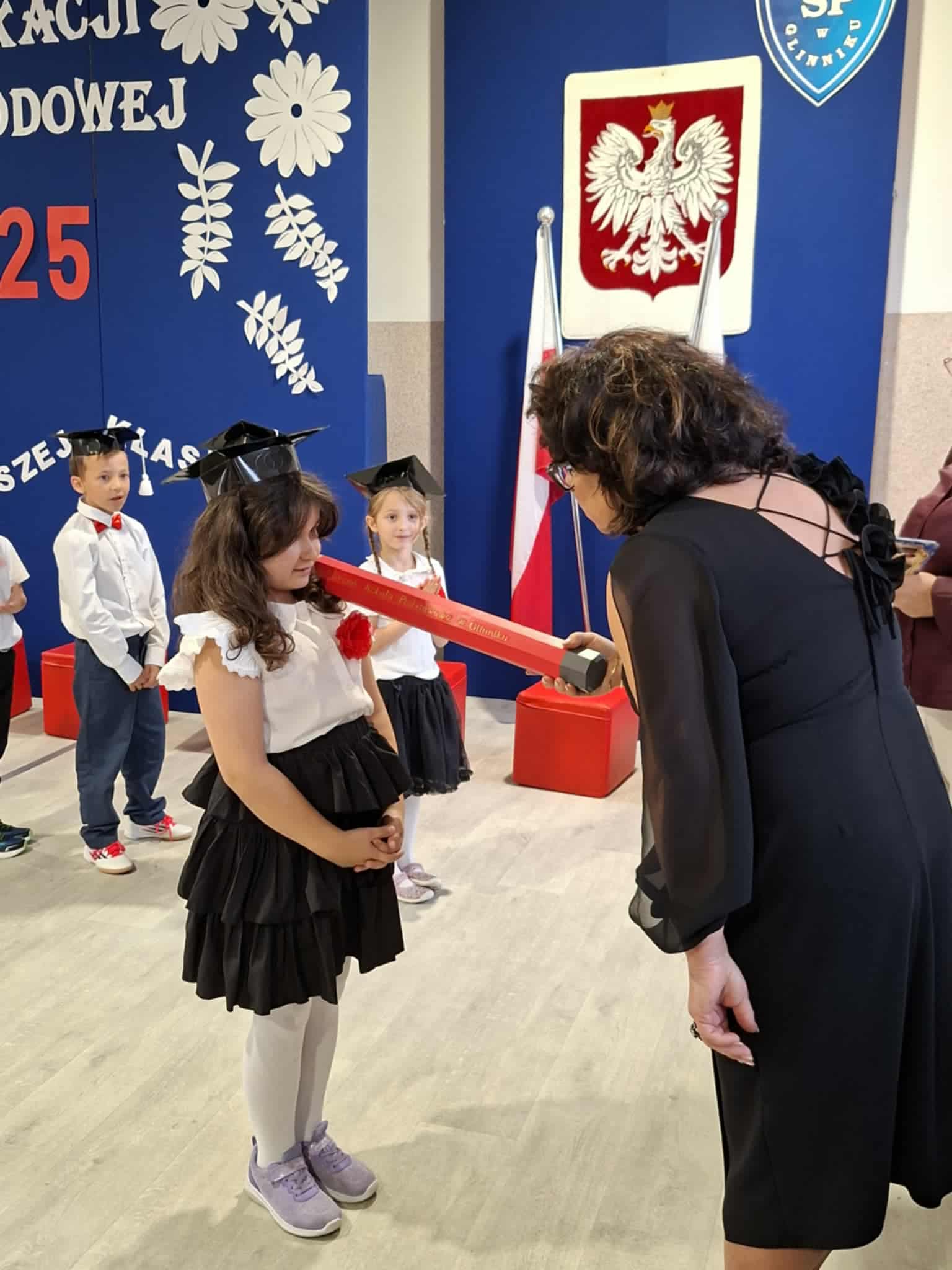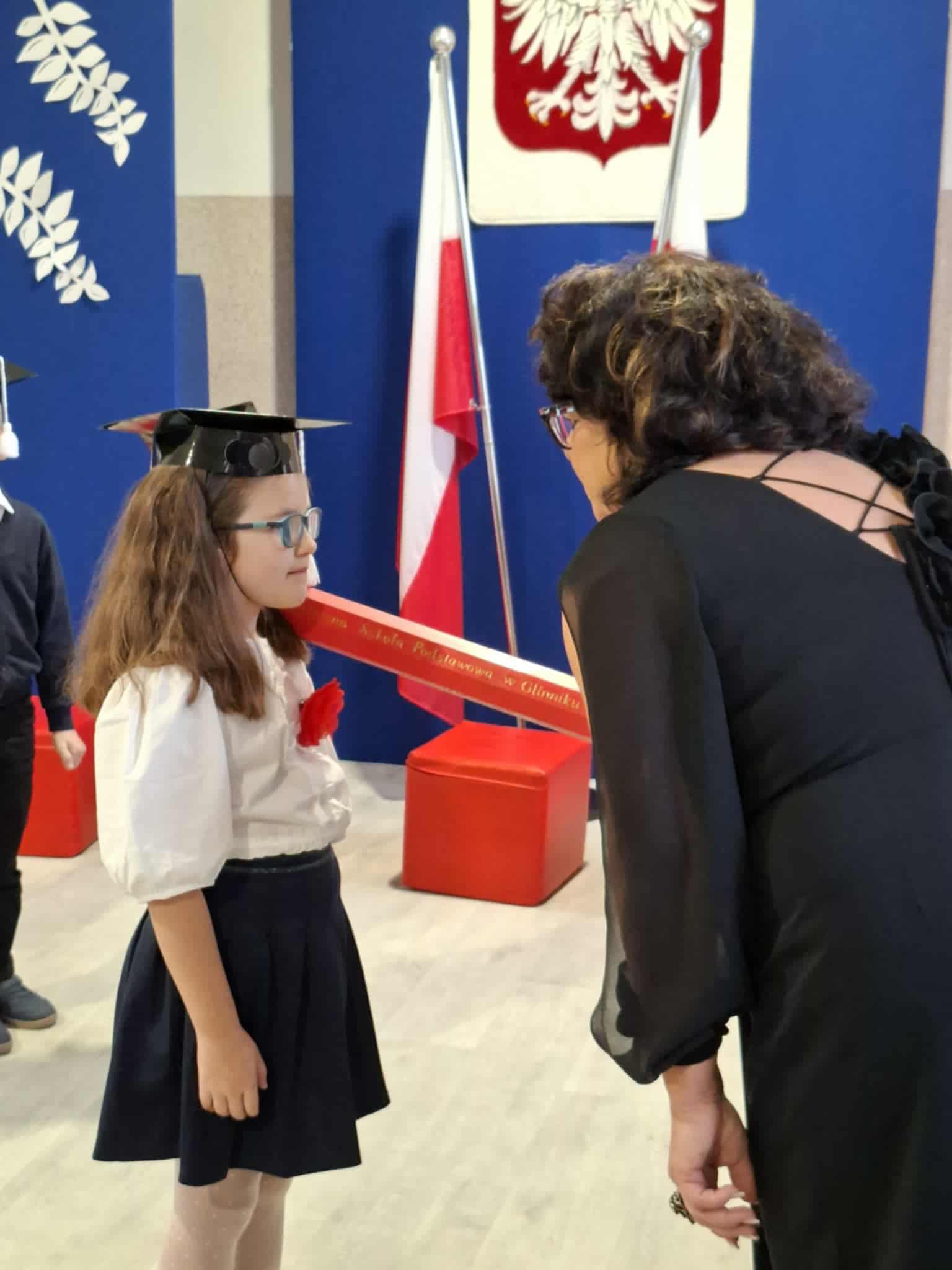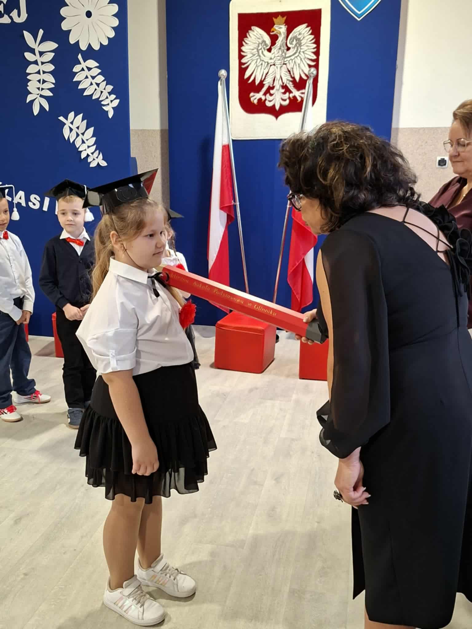 Następnie odbyło się uroczyste ślubowanie klasy I oraz pasowanie ich na uczniów Publicznej Szkoły Podstawowej w Glinniku, którego dokonała Pani Dyrektor, używając "magicznego" czerwonego ołówka. Pierwszoklasiści otrzymali piękne dyplomy, a Samorząd Uczniowski przygotował dla nich do wypicia sok z cytryny symbolizujący wyzwanie, które dzieci podjęły z uśmiechem, czym pokazały, że są gotowe stawić czoła trudnościom, jakie mogą pojawić się na ich edukacyjnej drodze. W nagrodę dostały od starszych kolegów drobne upominki. To był wyjątkowy moment, który na długo pozostanie w pamięci naszych najmłodszych uczniów i ich rodziców.