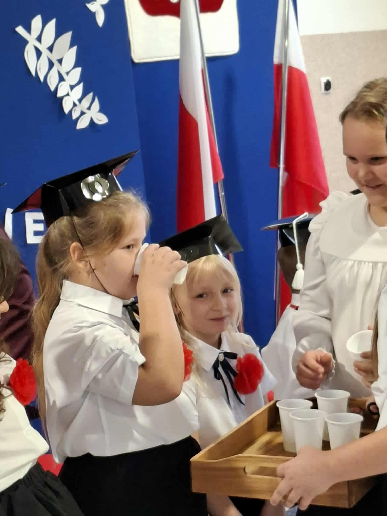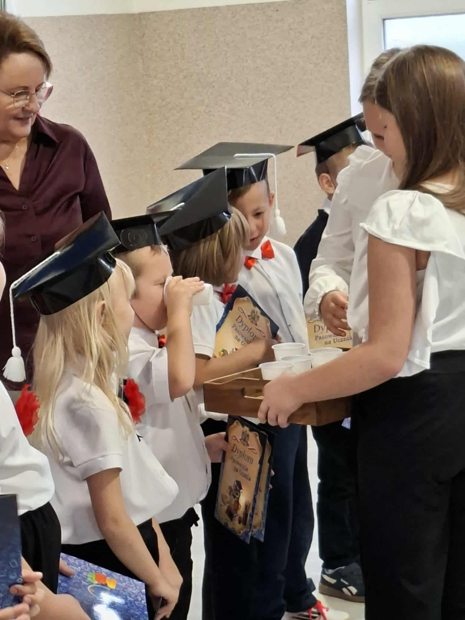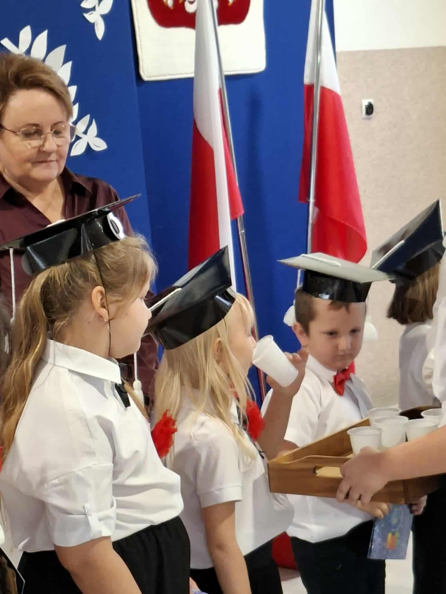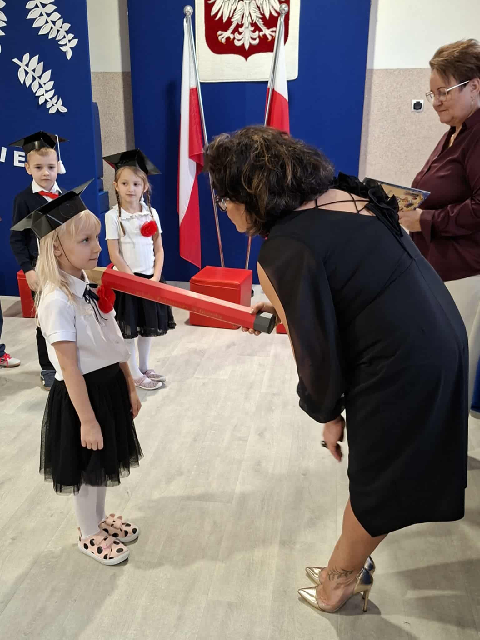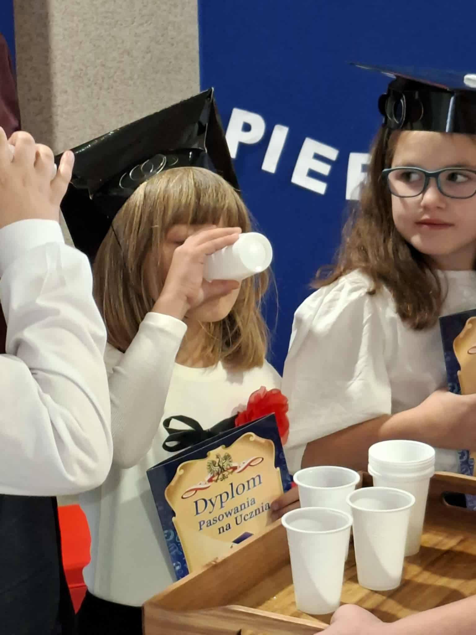 Następnie odbyło się uroczyste ślubowanie klasy I oraz pasowanie ich na uczniów Publicznej Szkoły Podstawowej w Glinniku, którego dokonała Pani Dyrektor, używając "magicznego" czerwonego ołówka. Pierwszoklasiści otrzymali piękne dyplomy, a Samorząd Uczniowski przygotował dla nich do wypicia sok z cytryny symbolizujący wyzwanie, które dzieci podjęły z uśmiechem, czym pokazały, że są gotowe stawić czoła trudnościom, jakie mogą pojawić się na ich edukacyjnej drodze. W nagrodę dostały od starszych kolegów drobne upominki. To był wyjątkowy moment, który na długo pozostanie w pamięci naszych najmłodszych uczniów i ich rodziców.