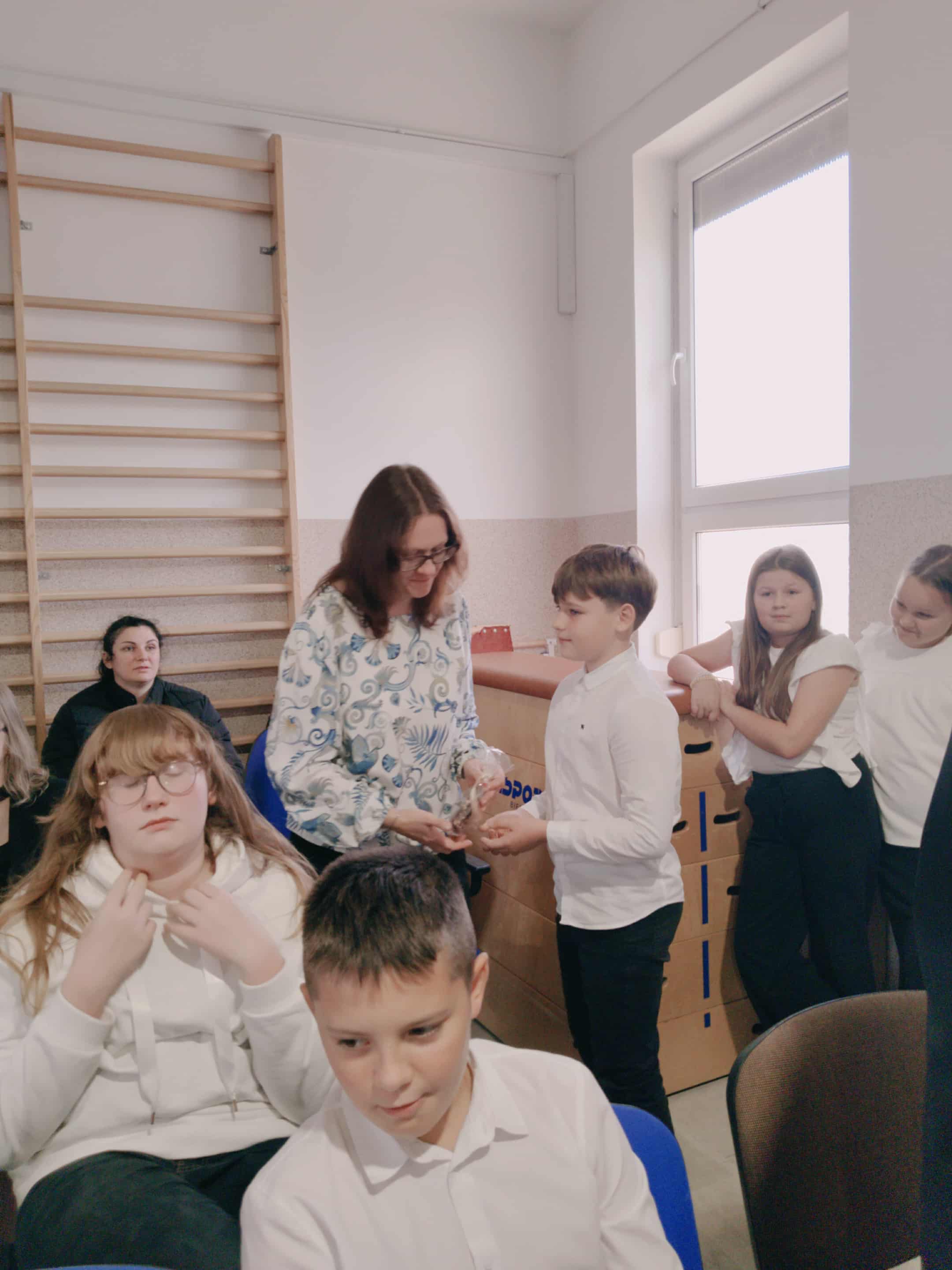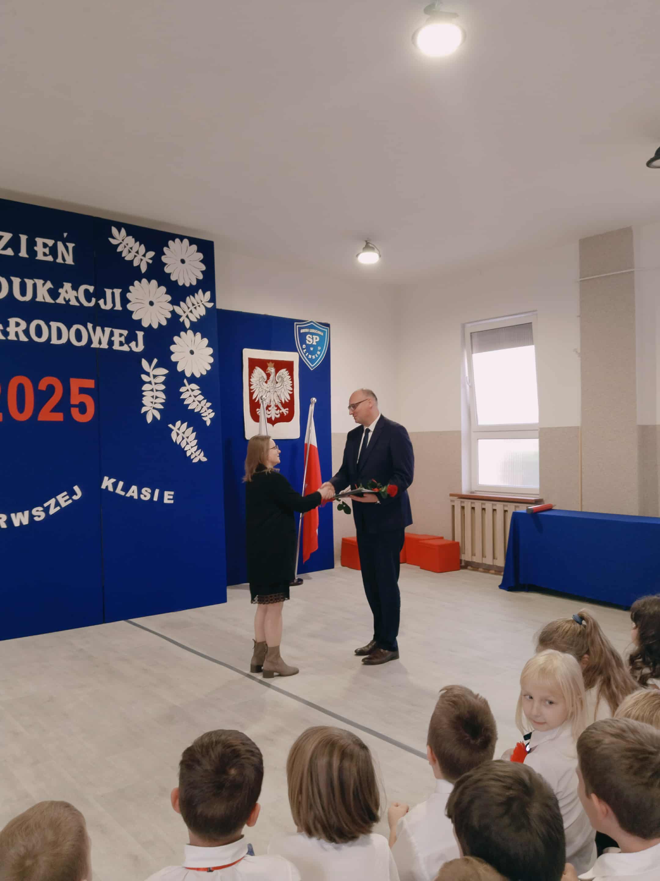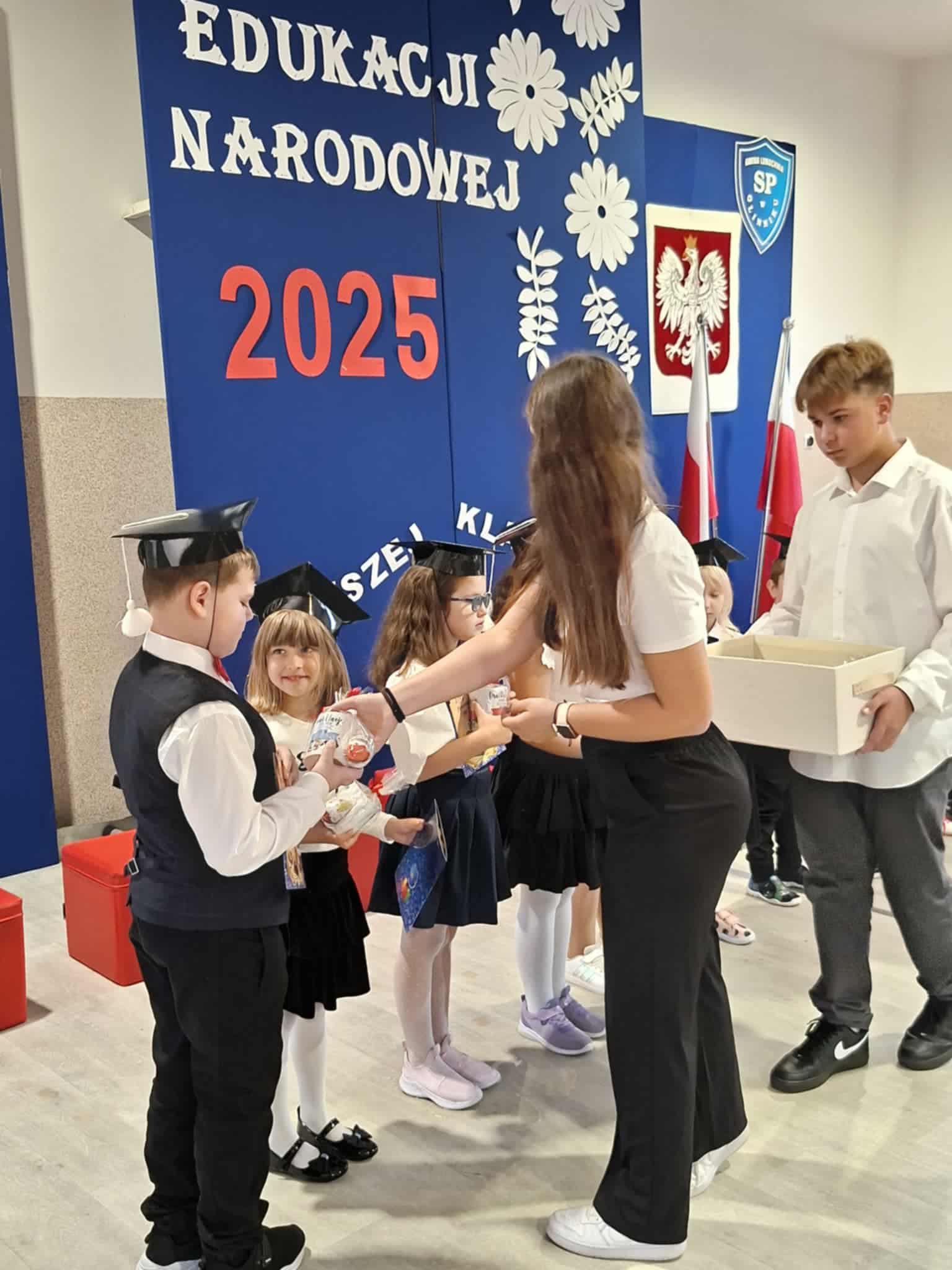 Następnie uczniowie klasy V przypomnieli wszystkim, jak ważne jest to święto – złożyli serdeczne życzenia wszystkim pracownikom szkoły i, w imieniu całej społeczności szkolnej, wręczyli drobne upominki, wyrażając wdzięczność za ich codzienny trud.