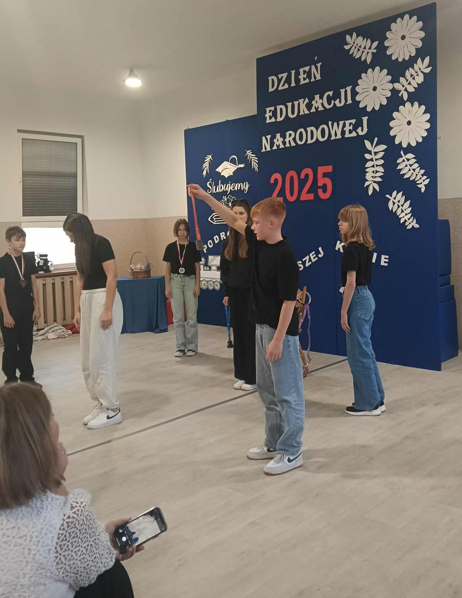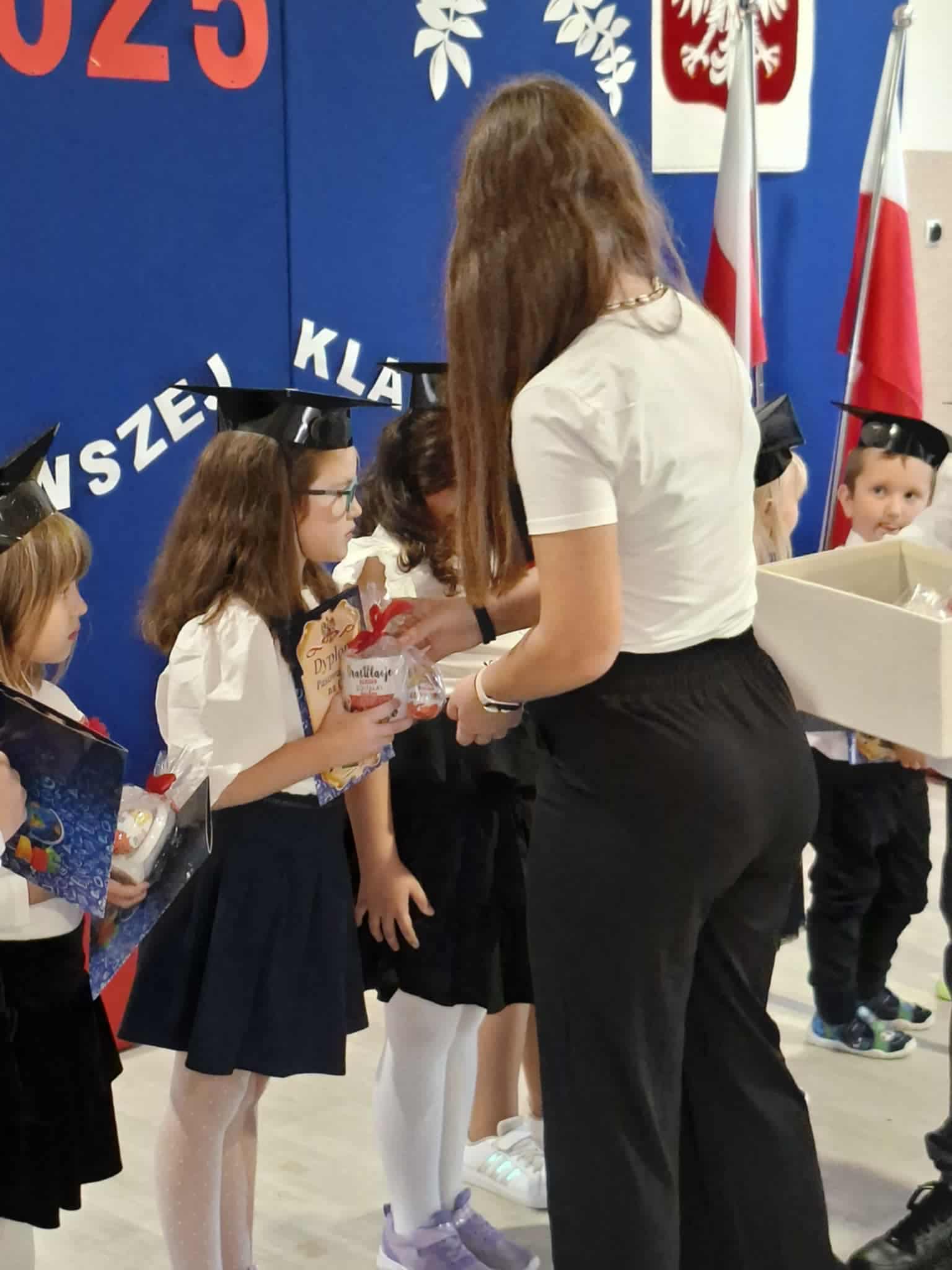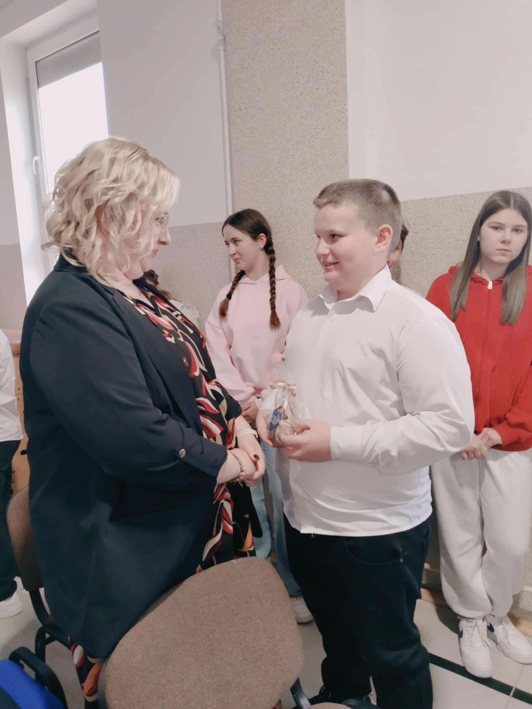 Następnie uczniowie klasy V przypomnieli wszystkim, jak ważne jest to święto – złożyli serdeczne życzenia wszystkim pracownikom szkoły i, w imieniu całej społeczności szkolnej, wręczyli drobne upominki, wyrażając wdzięczność za ich codzienny trud.