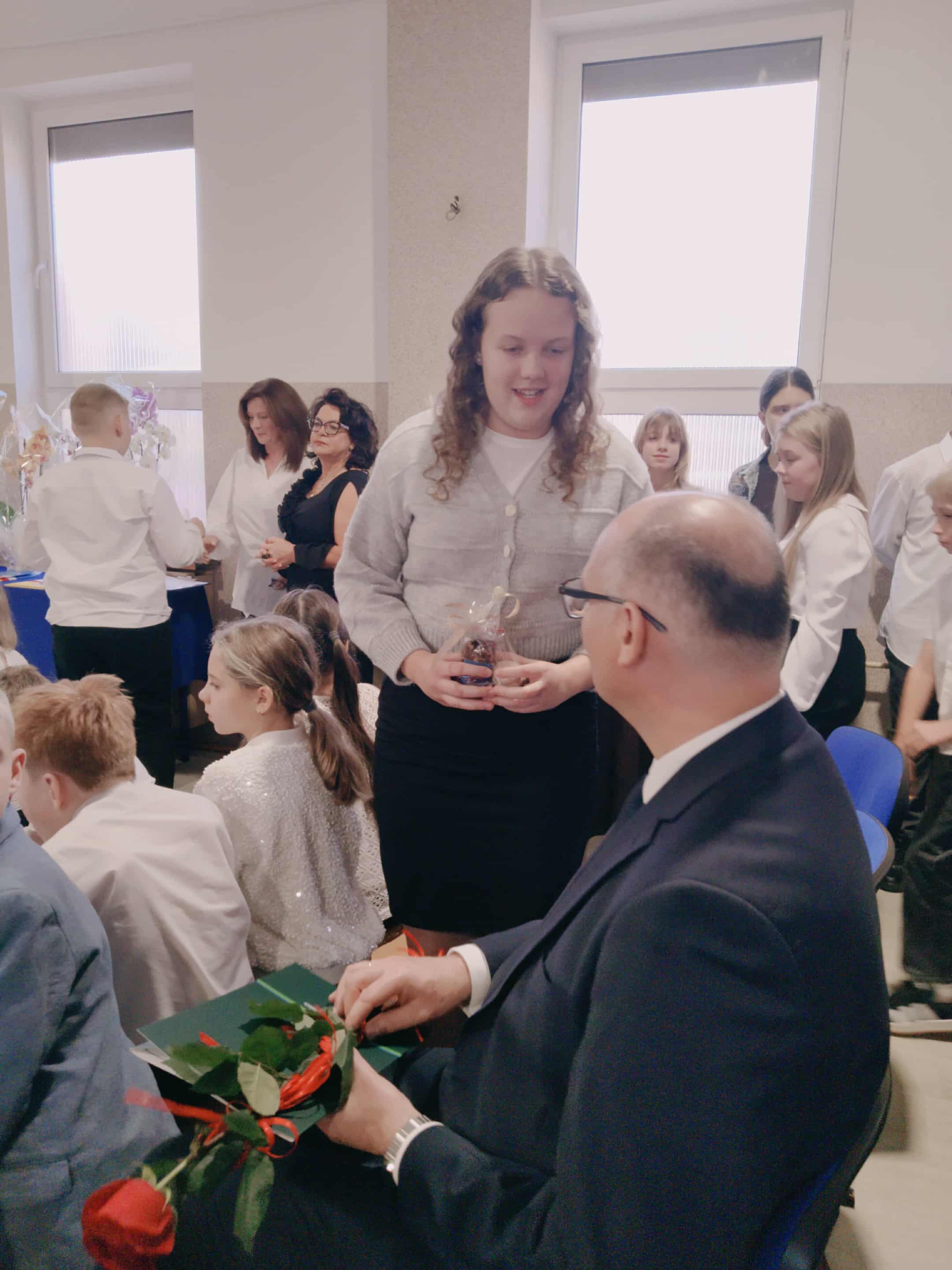 Na zakończenie uczniowie ze Szkolnego Teatrzyku "Myślnik": uczniowie: - Amelia Chmielewska kl. VIII - główna rola Kusicielki, Anna Wójciak kl. VII - rola nastolatki Ani nieulegającej presji grupy ; kl. VIII - Jakub Arkuszyński, Zuzanna Barwińska, Nikola Stańdo, Antoni Zimnicki oraz klasy VII - Lena Pecyna i Amelia Witek - w rolach rodziców; uczennice klasy VII - Zuzanna Cichowska, Sara Kita, Lena Majchrzak, Amelia Witek i Antoni Iwanicki z kl. VI w roli dzieci oraz Julia Rudzka jako lektor. Oprócz kwiatów i słów wdzięczności, podarowali obecnym przedstawienie w reżyserii pani Małgorzaty Smolarek pt. "Sekret", które było głosem młodych ludzi w sprawach dla nich bardzo ważnych związanych z mijającym Tygodniem o przeciwstawianiu się przemocy. Przedstawienie było nie tylko artystycznym wydarzeniem, ale także okazją do refleksji nad wartościami, które są dla naszych uczniów istotne, a wymagają wciąż uwagi, empatii, a czasem konkretnego działania.