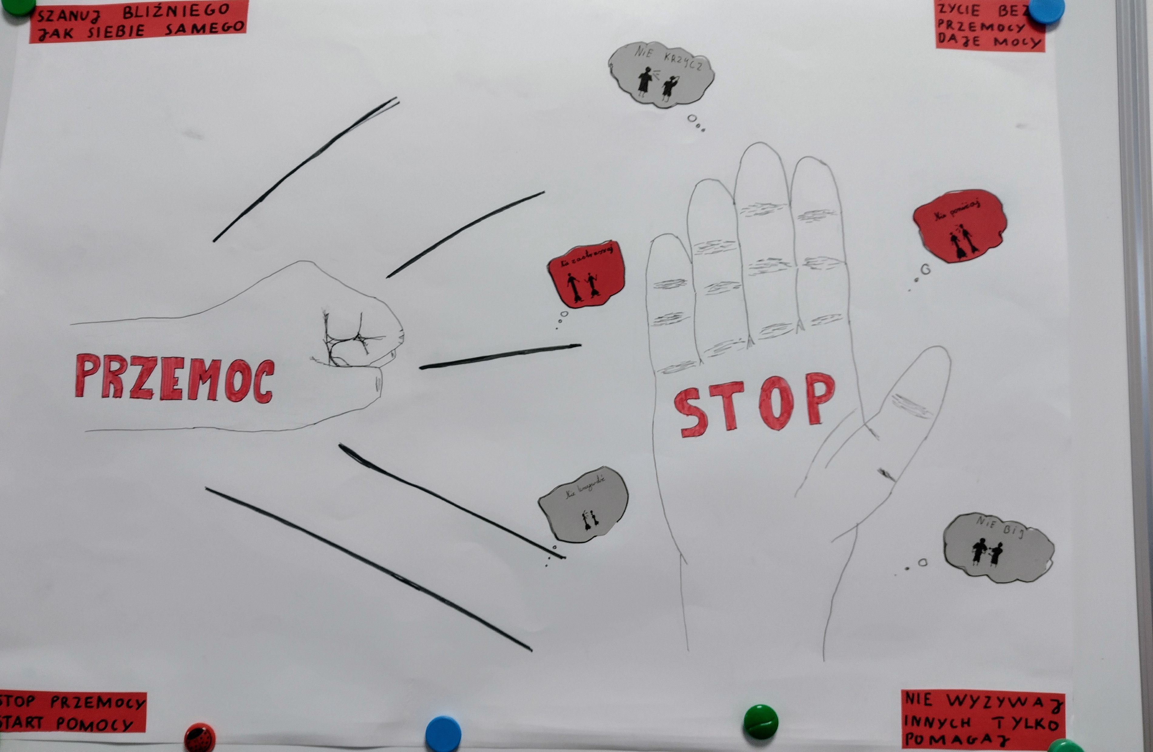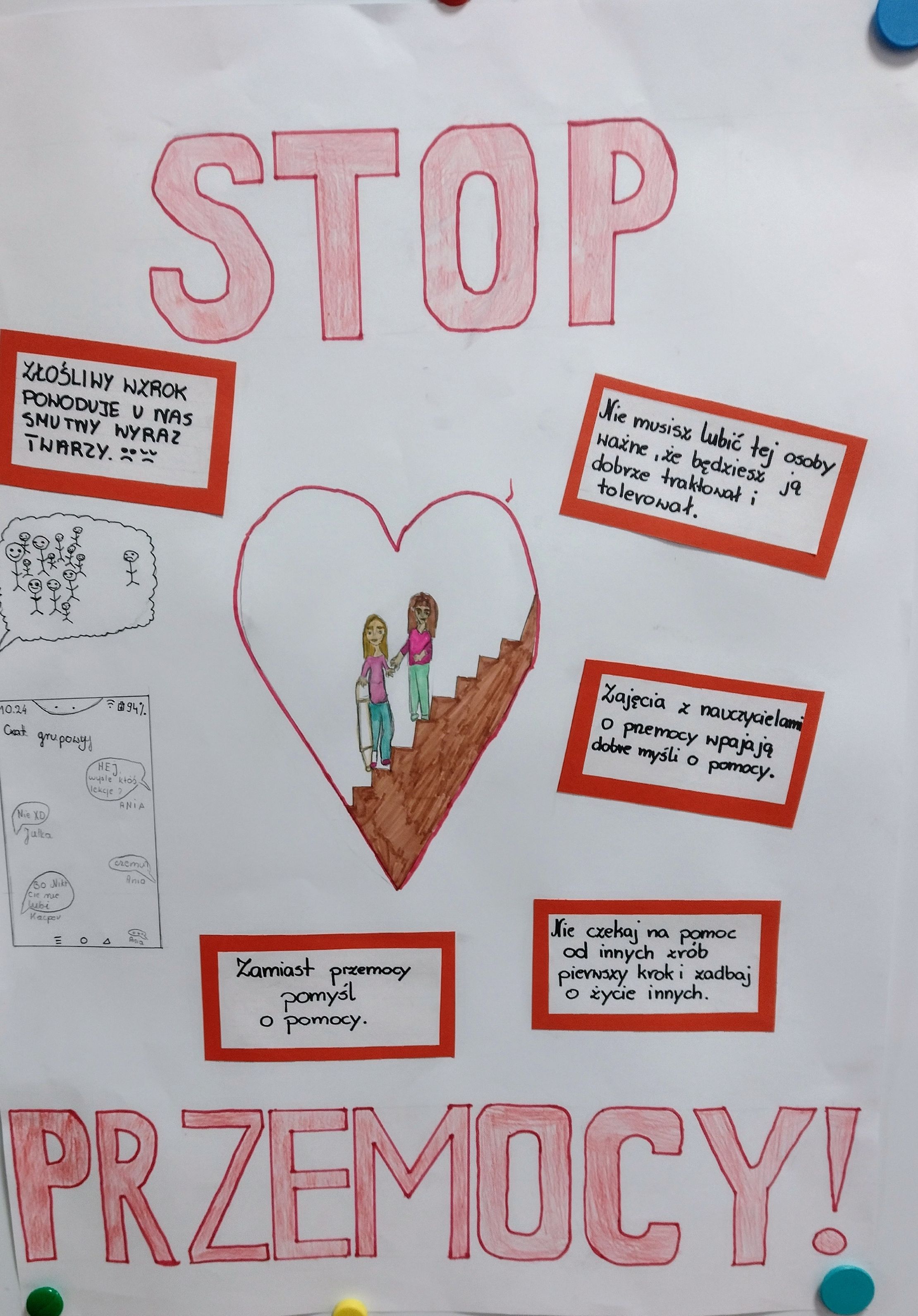 3. Przygotowywanie plakatów promujących przeciwdziałanie agresji rówieśniczej pod hasłem: „TOLERANCJA NIE AGRESJA”.