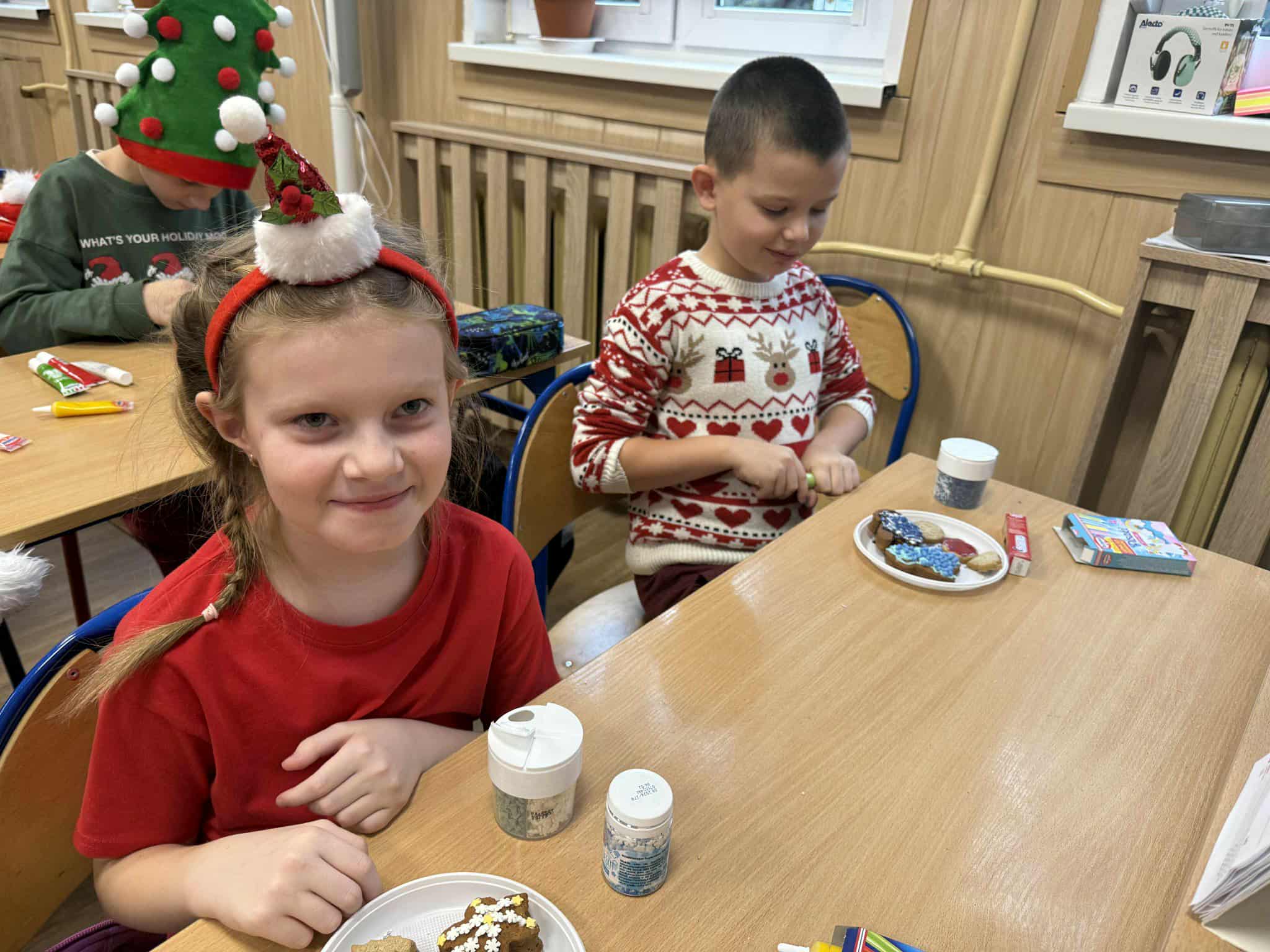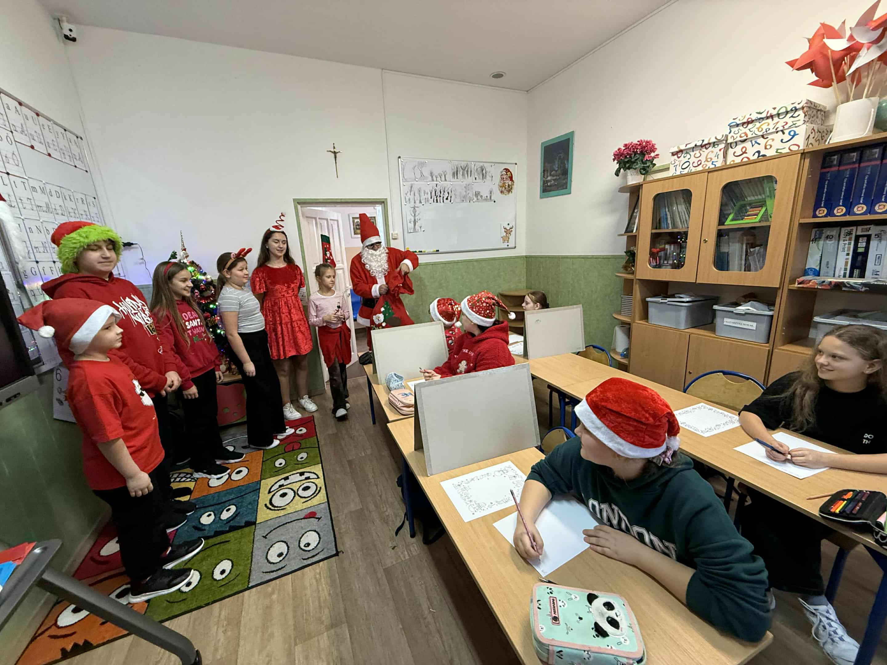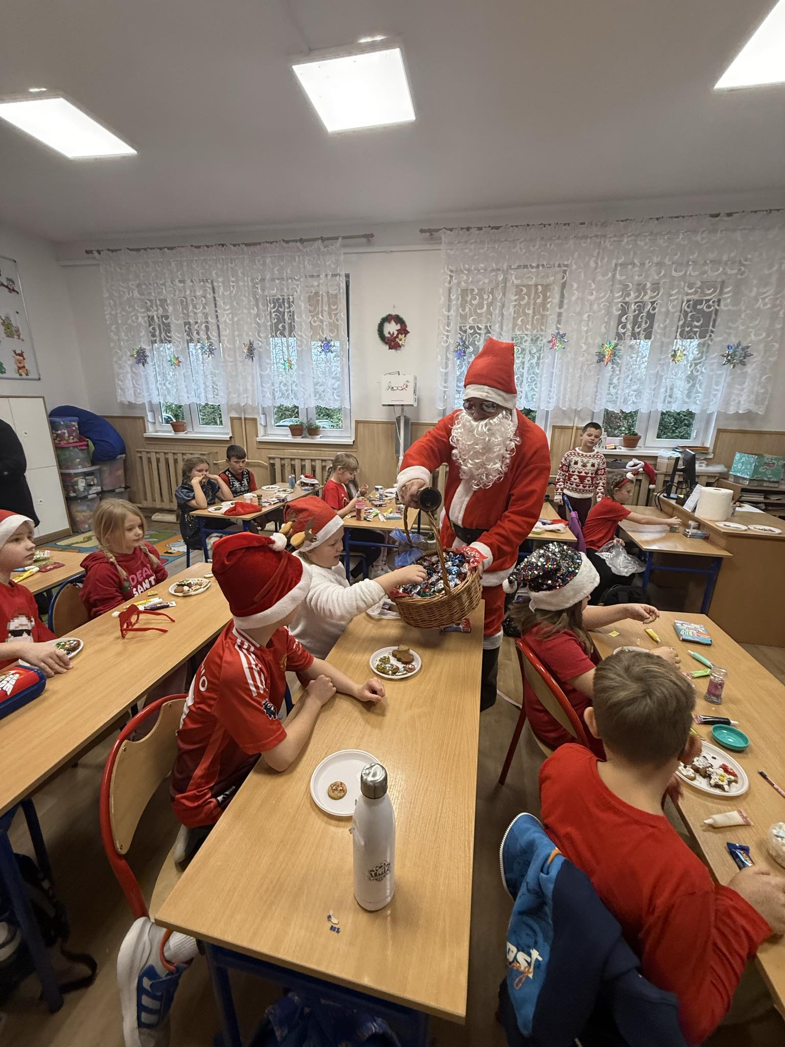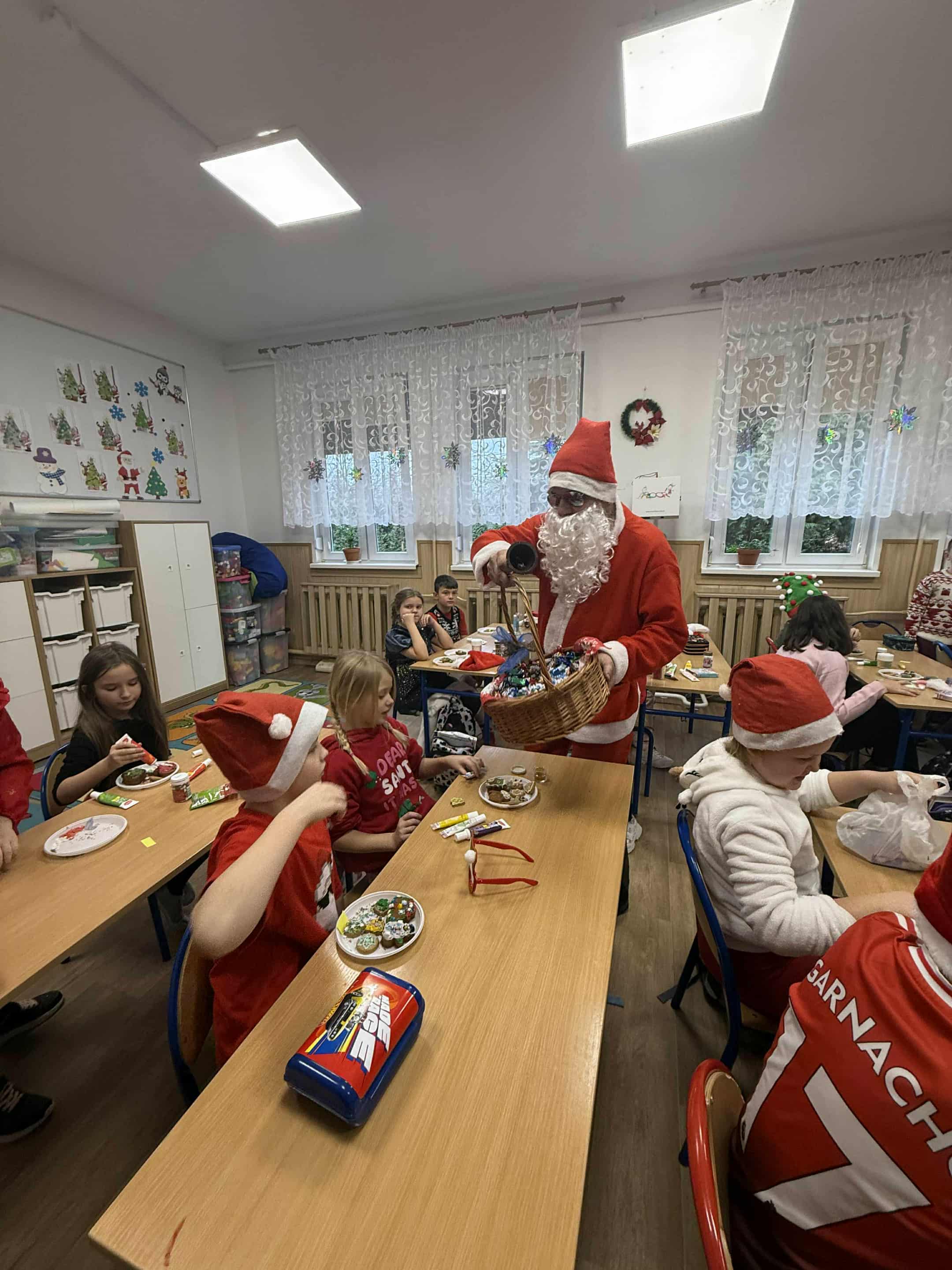 6 grudnia w naszej szkole zapanowała prawdziwie świąteczna atmosfera! Uczniowie i nauczyciele założyli mikołajkowe czapki oraz kolorowe, zimowe sweterki, wprowadzając wszystkich w magiczny nastrój. Nie zabrakło oczywiście najważniejszego gościa Świętego Mikołaja, który obdarował dzieci drobnymi upominkami, słodyczami ufundowanymi przez Radę Rodziców. Wspierały go uśmiechnięte elfy z Samorządu Uczniowskiego, rozdając prezentowe boksy pełne żelków i magnetycznych zakładek do książek. Najmłodsi uczniowie mieli okazję wykazać się kreatywnością, dekorując pachnące pierniczki. Wszyscy chętnie pozowali do wspólnych, radosnych zdjęć, które na długo będą przypominać o tym wyjątkowym dniu. To był czas pełen uśmiechu, zabawy i świątecznej magii! Dziękujemy wszystkim, którzy przyczynili się do organizacji tego wydarzenia.