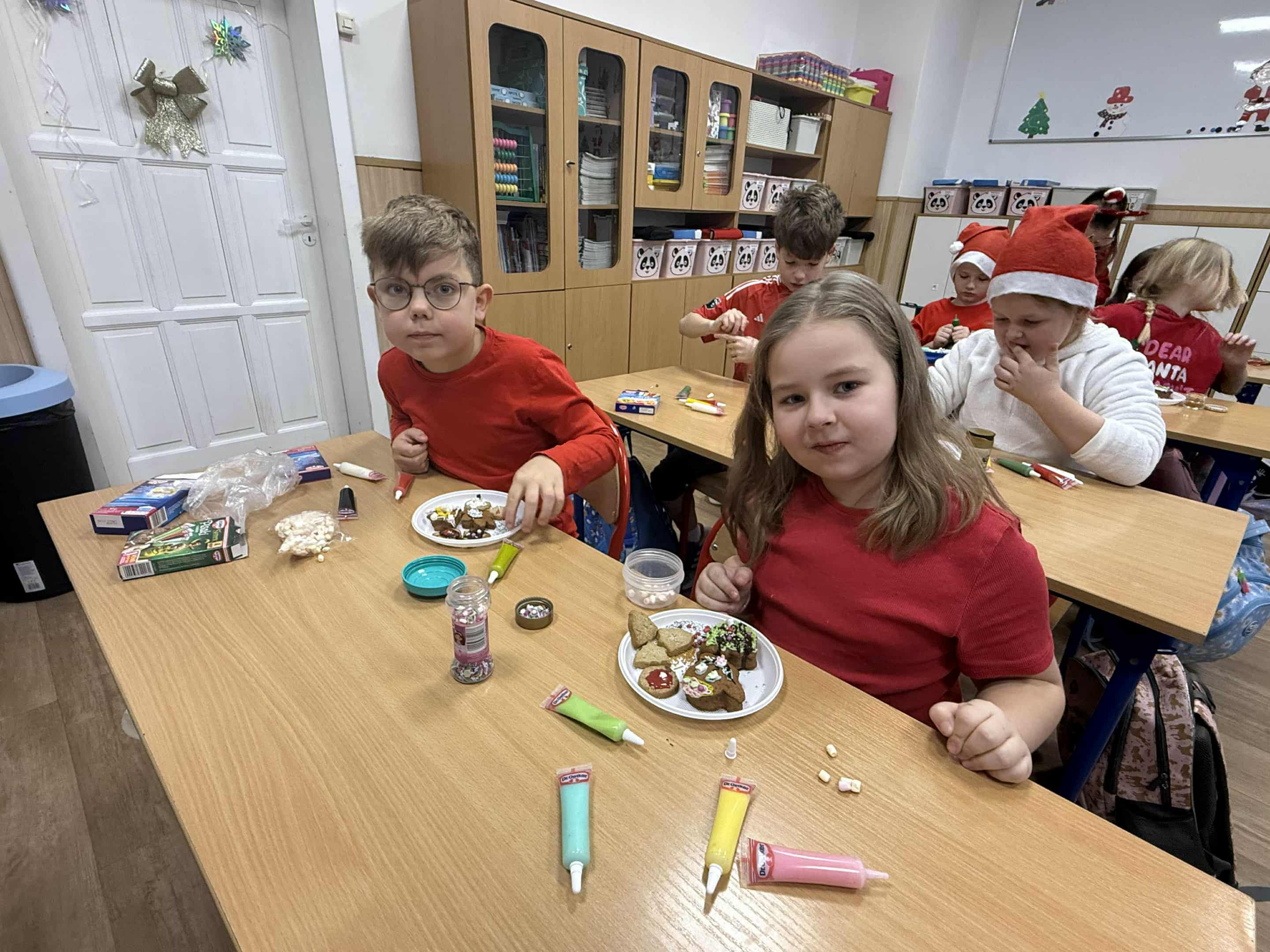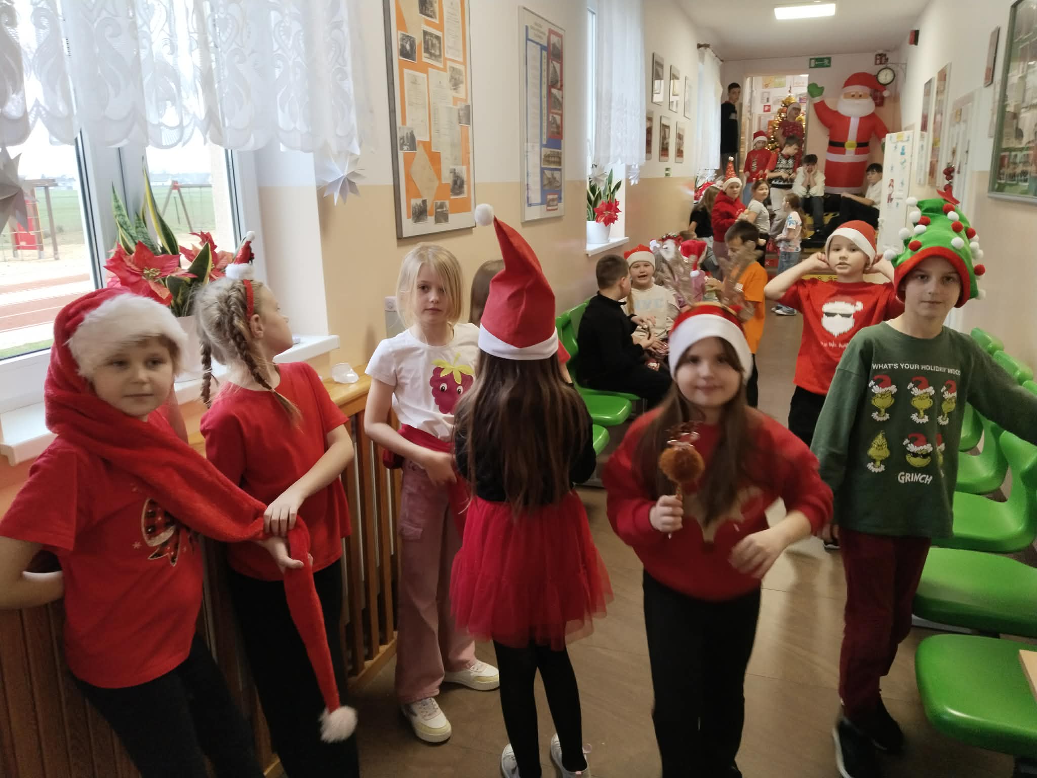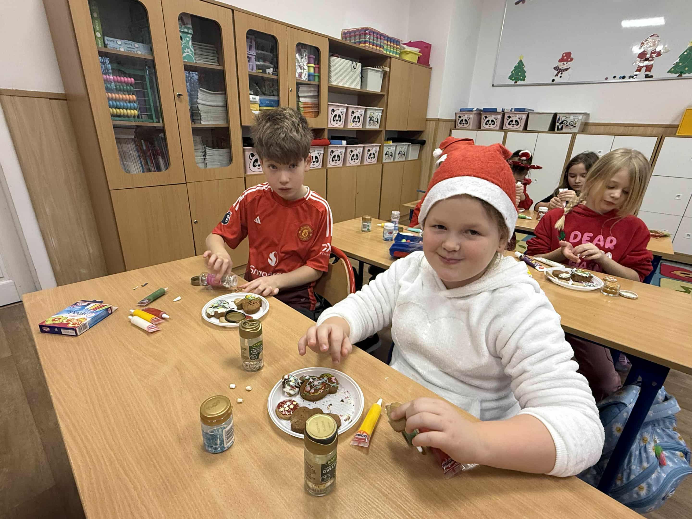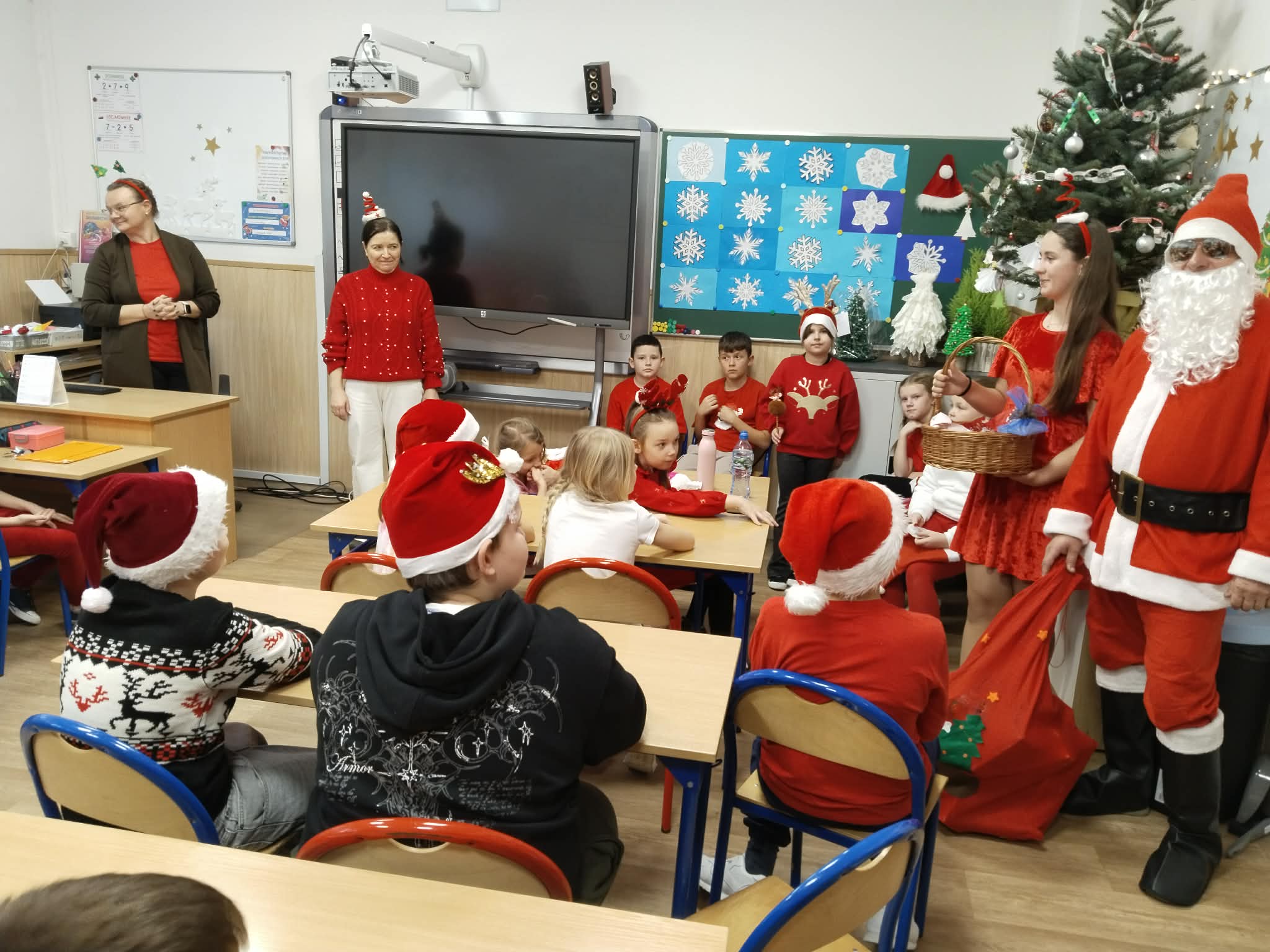 6 grudnia w naszej szkole zapanowała prawdziwie świąteczna atmosfera! Uczniowie i nauczyciele założyli mikołajkowe czapki oraz kolorowe, zimowe sweterki, wprowadzając wszystkich w magiczny nastrój. Nie zabrakło oczywiście najważniejszego gościa Świętego Mikołaja, który obdarował dzieci drobnymi upominkami, słodyczami ufundowanymi przez Radę Rodziców. Wspierały go uśmiechnięte elfy z Samorządu Uczniowskiego, rozdając prezentowe boksy pełne żelków i magnetycznych zakładek do książek. Najmłodsi uczniowie mieli okazję wykazać się kreatywnością, dekorując pachnące pierniczki. Wszyscy chętnie pozowali do wspólnych, radosnych zdjęć, które na długo będą przypominać o tym wyjątkowym dniu. To był czas pełen uśmiechu, zabawy i świątecznej magii! Dziękujemy wszystkim, którzy przyczynili się do organizacji tego wydarzenia.