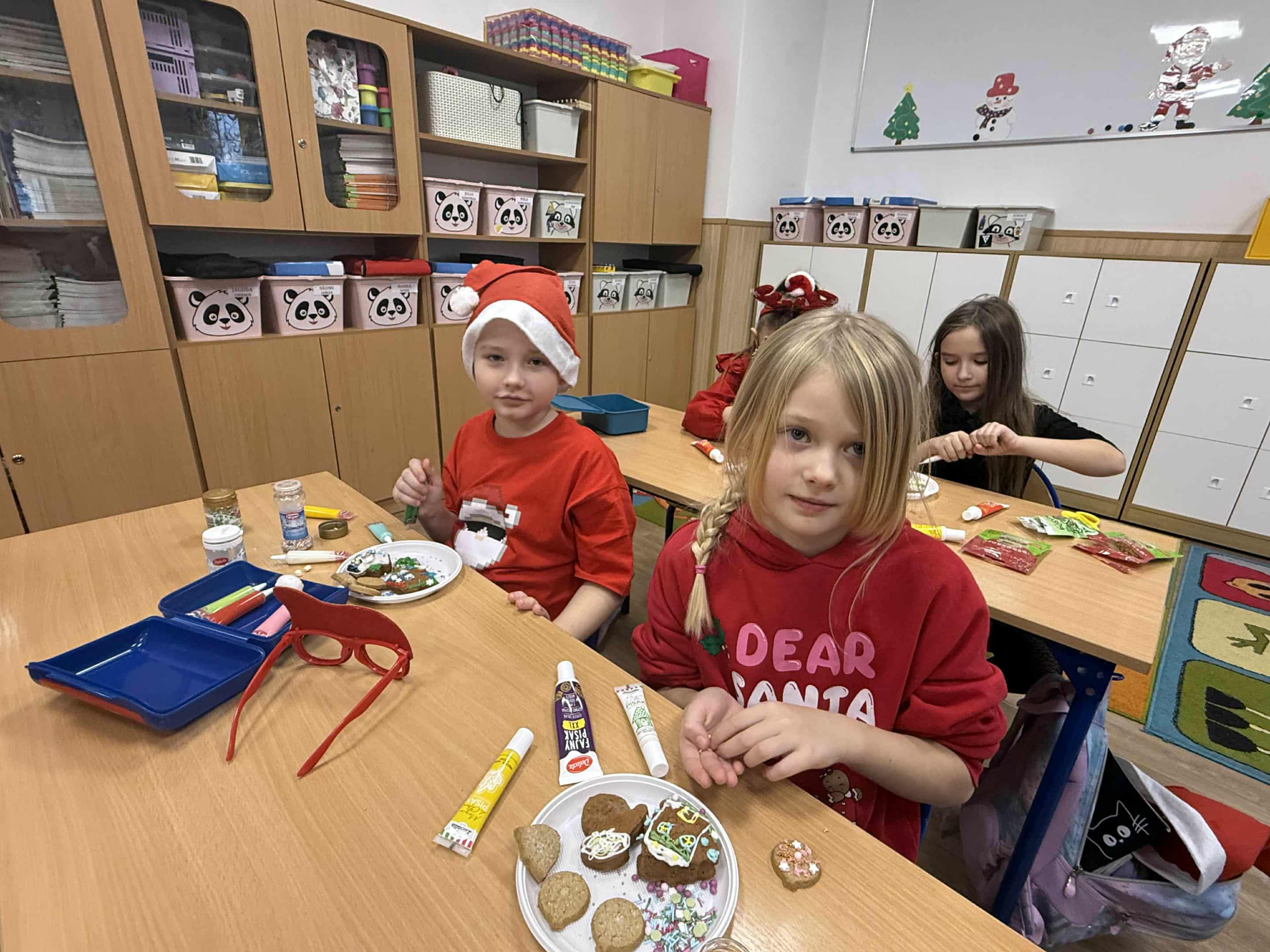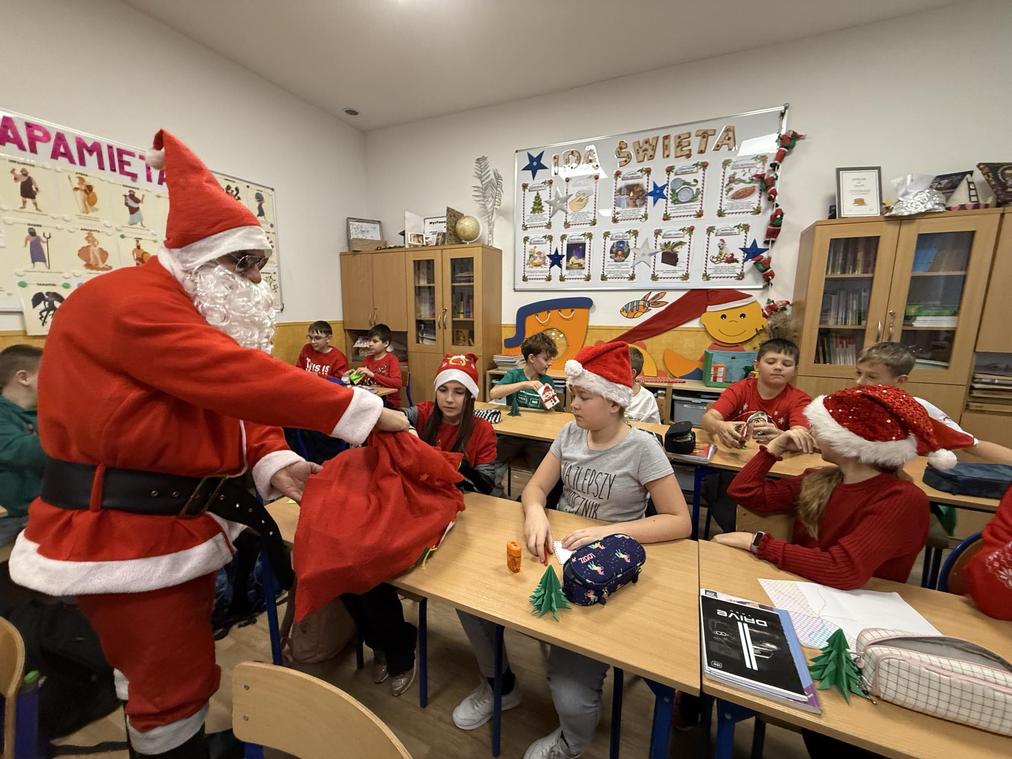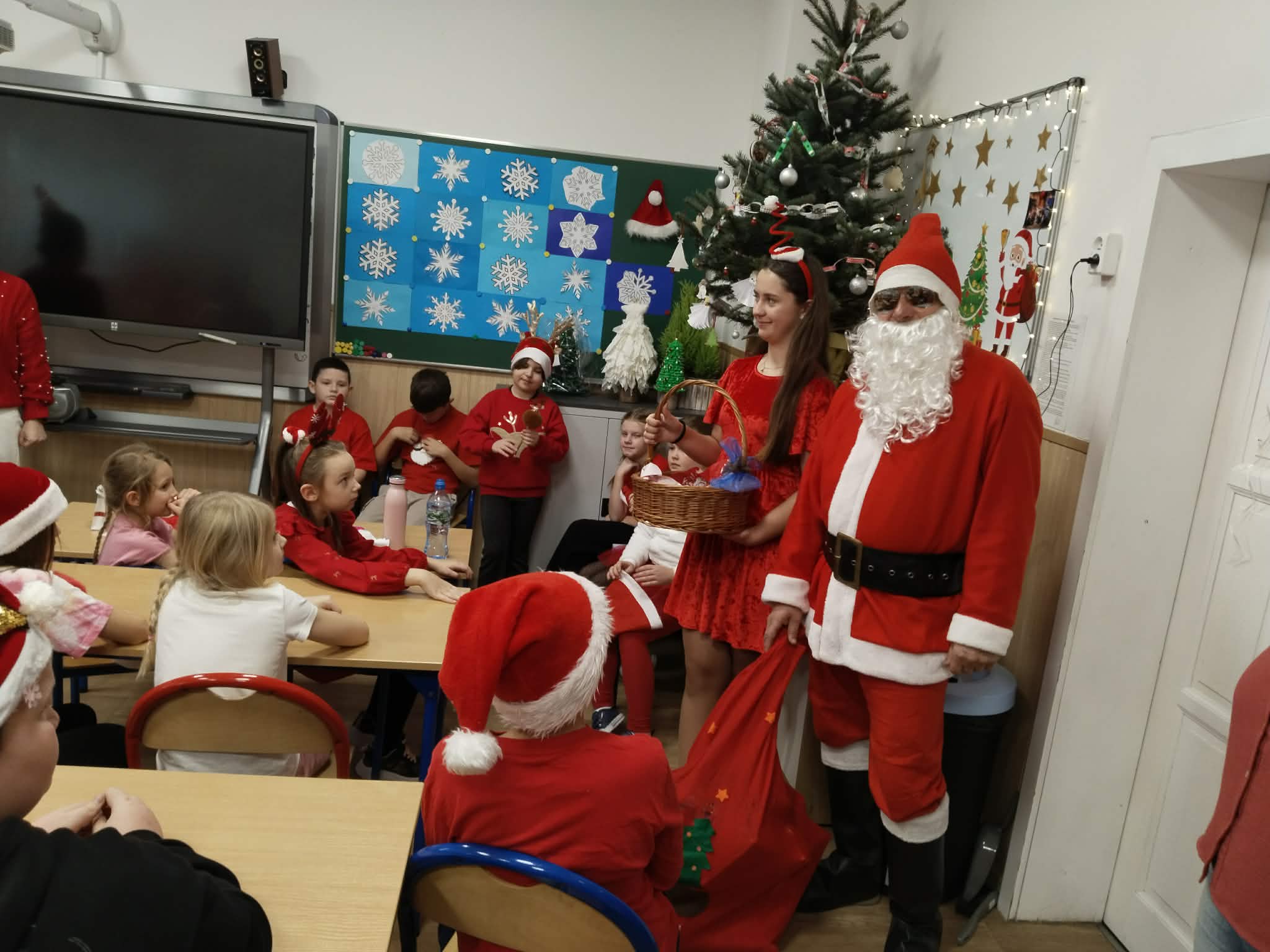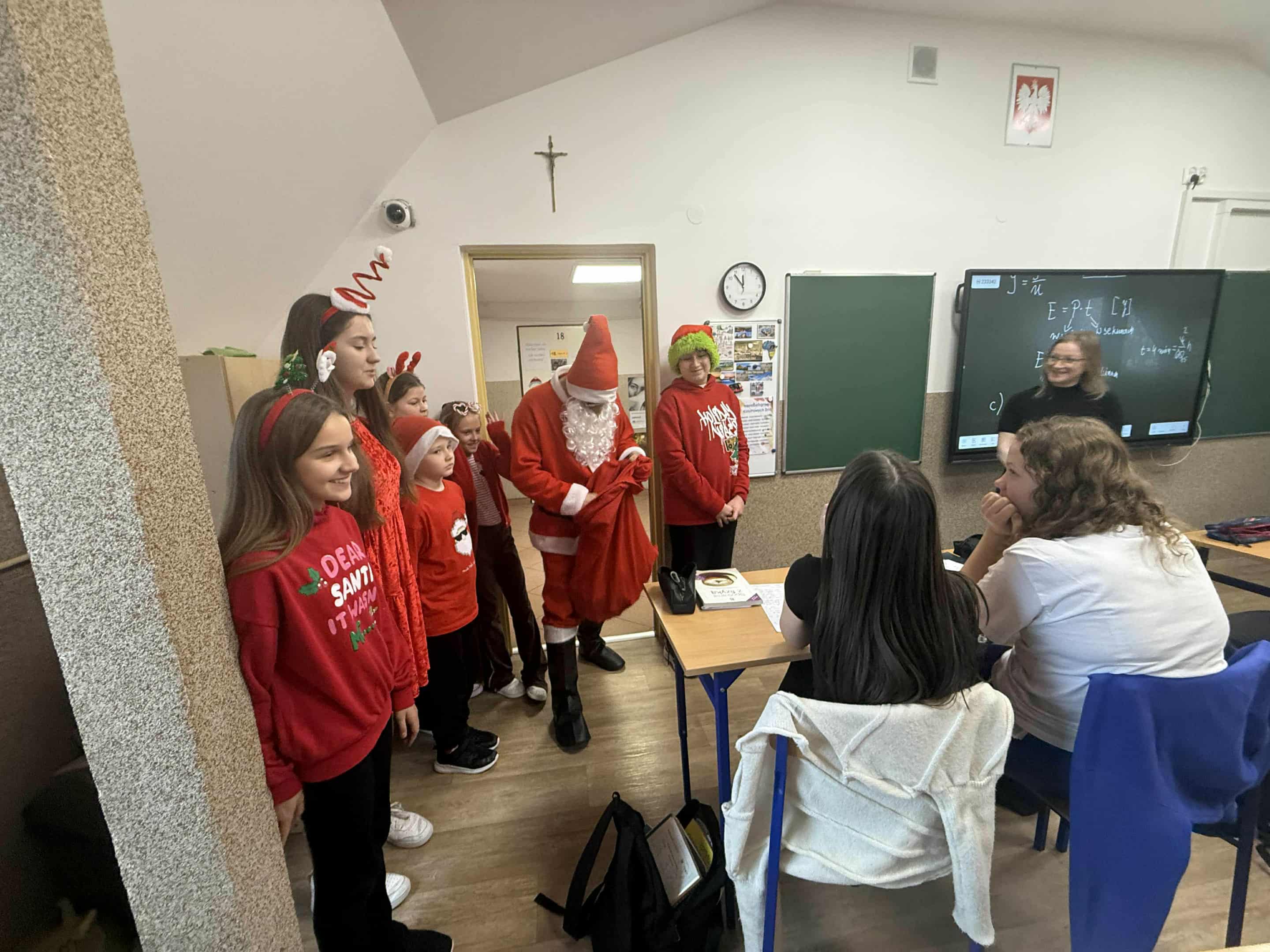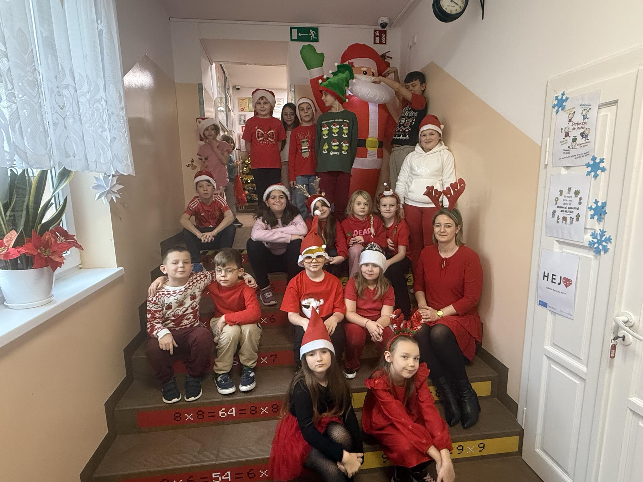 6 grudnia w naszej szkole zapanowała prawdziwie świąteczna atmosfera! Uczniowie i nauczyciele założyli mikołajkowe czapki oraz kolorowe, zimowe sweterki, wprowadzając wszystkich w magiczny nastrój. Nie zabrakło oczywiście najważniejszego gościa Świętego Mikołaja, który obdarował dzieci drobnymi upominkami, słodyczami ufundowanymi przez Radę Rodziców. Wspierały go uśmiechnięte elfy z Samorządu Uczniowskiego, rozdając prezentowe boksy pełne żelków i magnetycznych zakładek do książek. Najmłodsi uczniowie mieli okazję wykazać się kreatywnością, dekorując pachnące pierniczki. Wszyscy chętnie pozowali do wspólnych, radosnych zdjęć, które na długo będą przypominać o tym wyjątkowym dniu. To był czas pełen uśmiechu, zabawy i świątecznej magii! Dziękujemy wszystkim, którzy przyczynili się do organizacji tego wydarzenia.