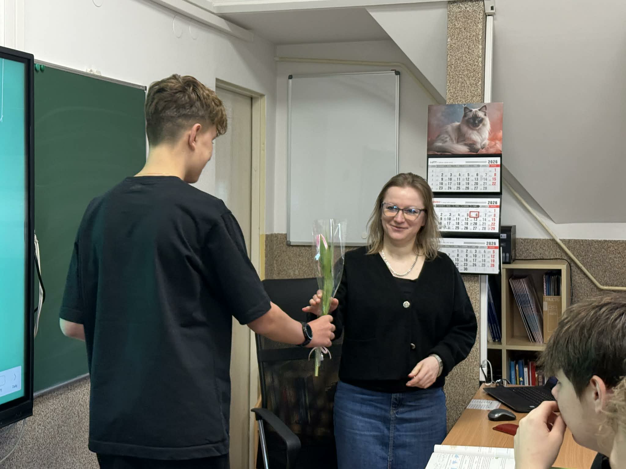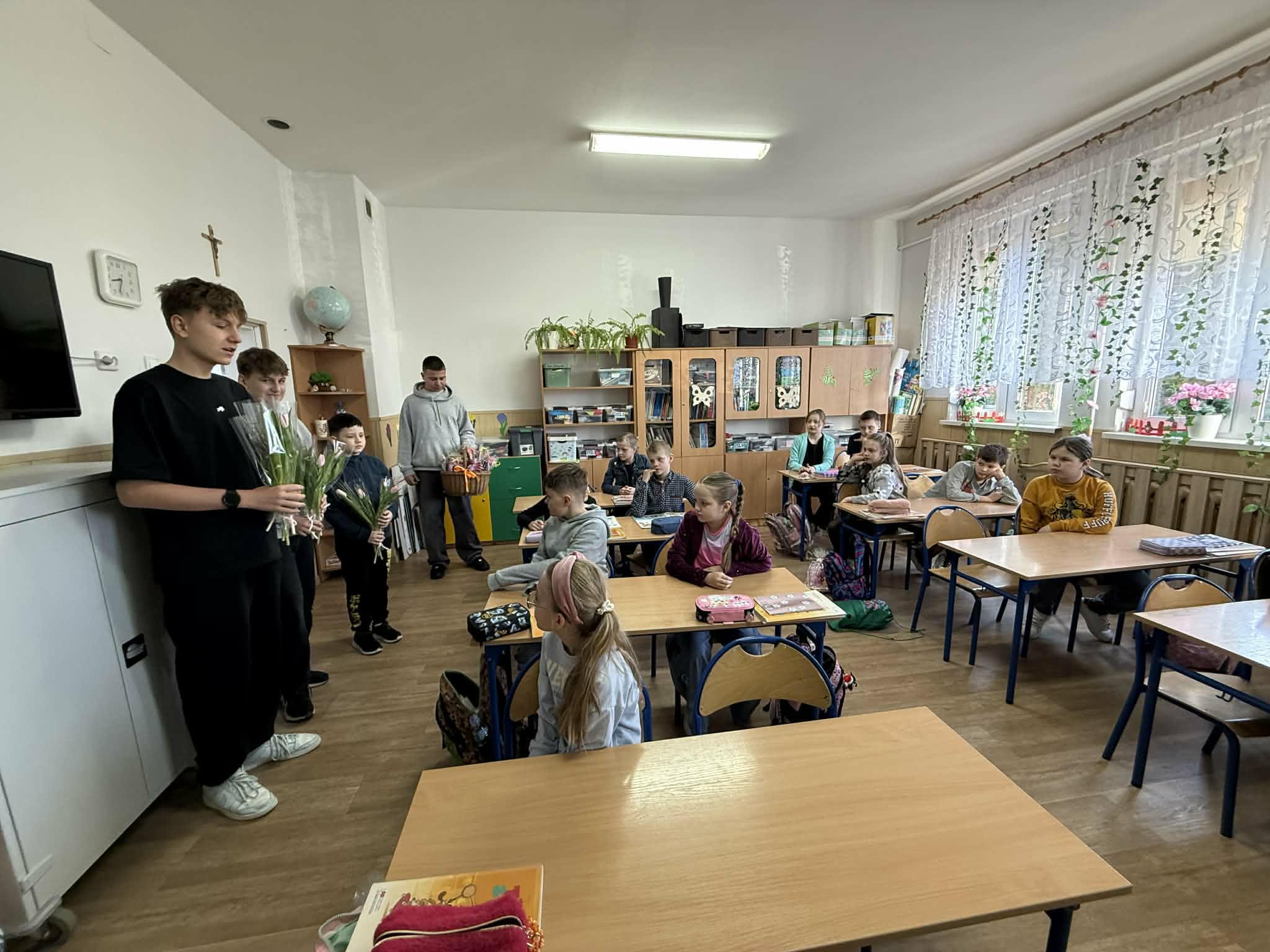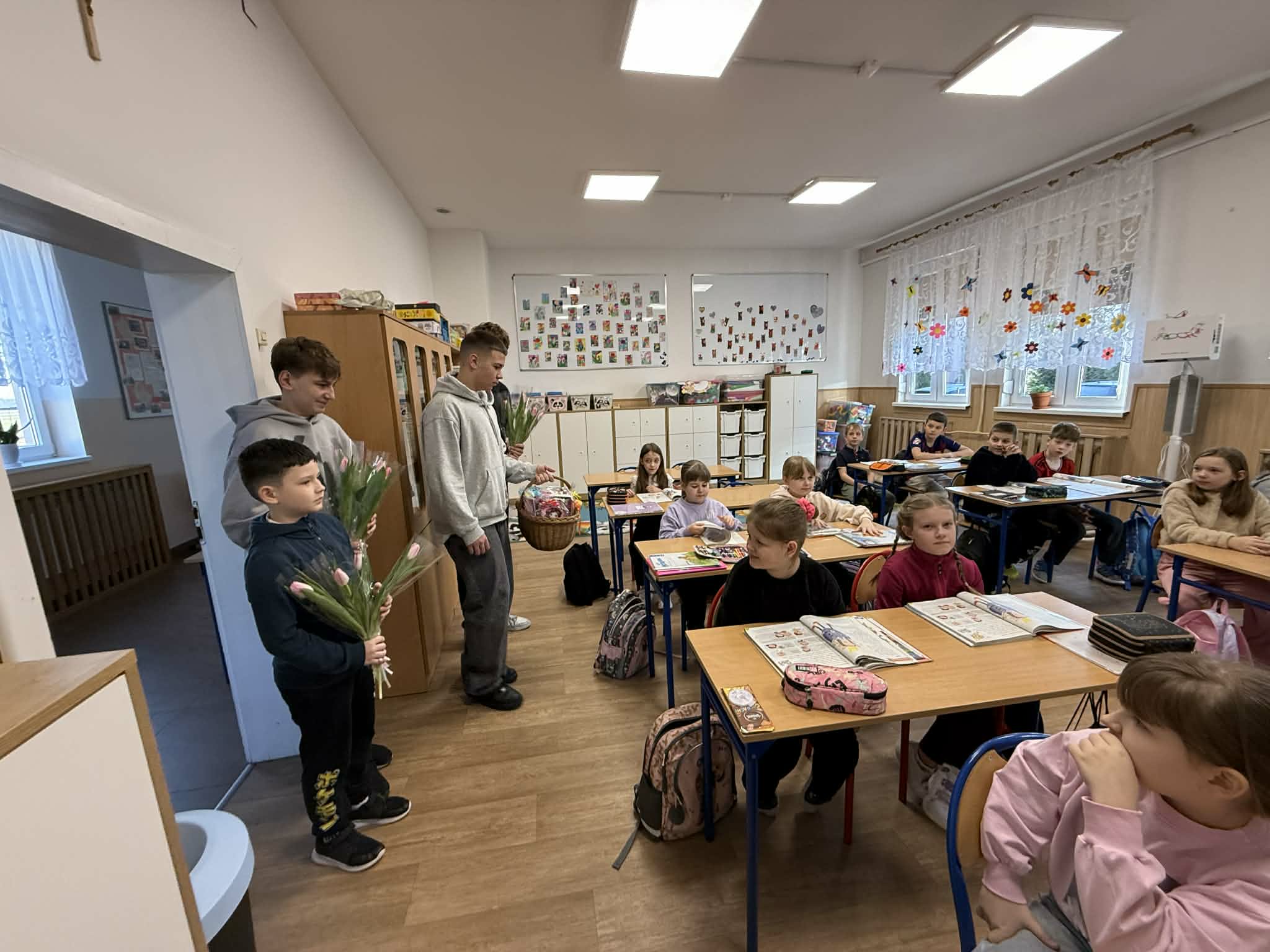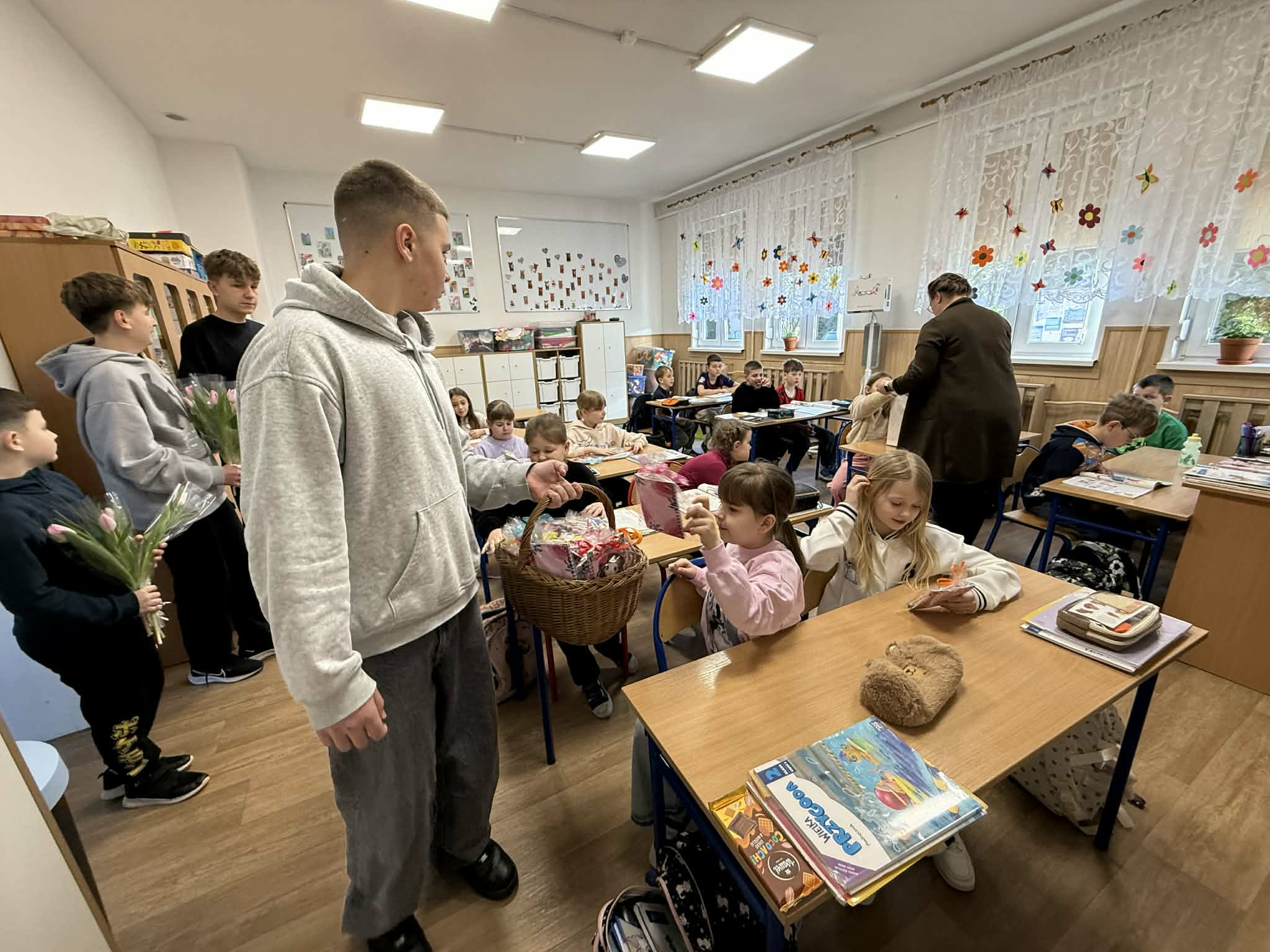 8 marca w naszej szkole obchodziliśmy Dzień Kobiet, który z ogromnym zaangażowaniem przygotowali chłopcy z Samorządu Uczniowskiego. Już od rana w szkolnych korytarzach panowała wyjątkowo miła i radosna atmosfera. Chłopcy zadbali o to, by każda kobieta; zarówno uczennica, jak i nauczycielka poczuła się w tym dniu wyjątkowo. Nauczycielki i pracownice szkoły otrzymały piękne, kolorowe tulipany, które wywołały wiele uśmiechów i wzruszeń. Dziewczynki zostały obdarowane upominkami: uroczymi notesikami "cudownej dziewczyny" oraz okolicznościowymi długopisami. Na wszystkich czekał również pyszny poczęstunek - świeży popcorn i słodkie, domowe babeczki. Był to dzień pełen życzliwości, radości i miłych gestów, które na długo pozostaną w pamięci. Serdecznie dziękujemy chłopcom z Samorządu Uczniowskiego za ich pomysłowość, kulturę i wspaniałe przygotowanie tego wyjątkowego święta!