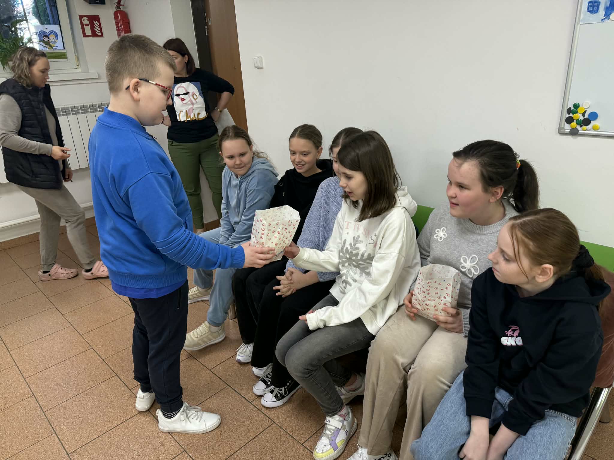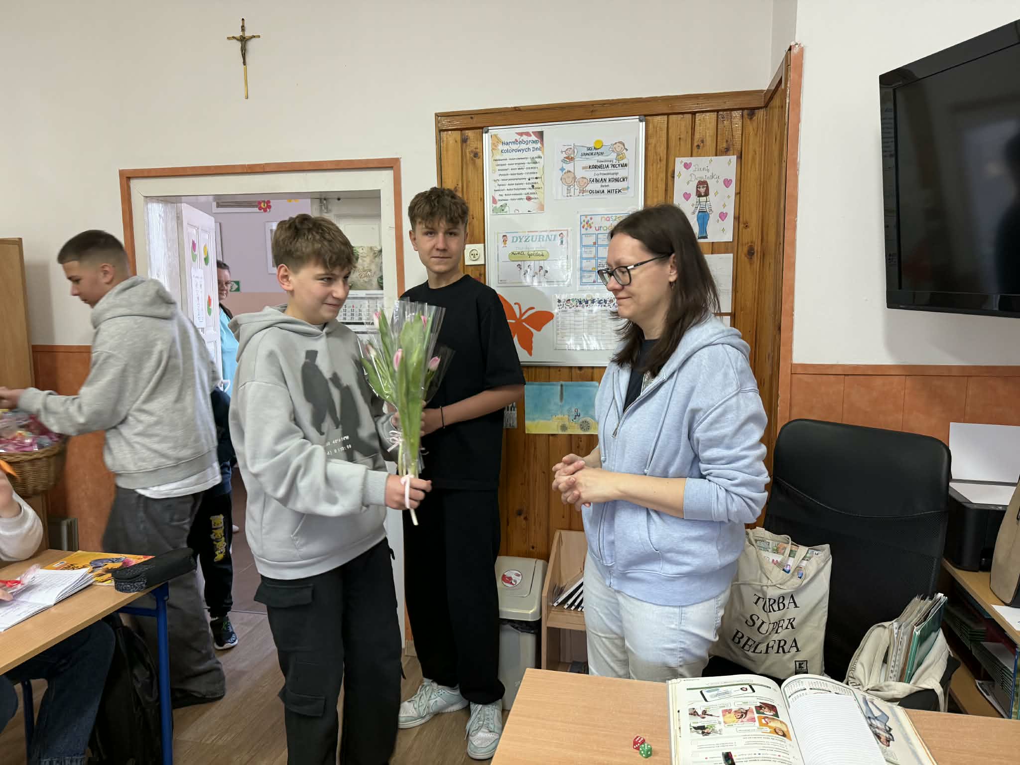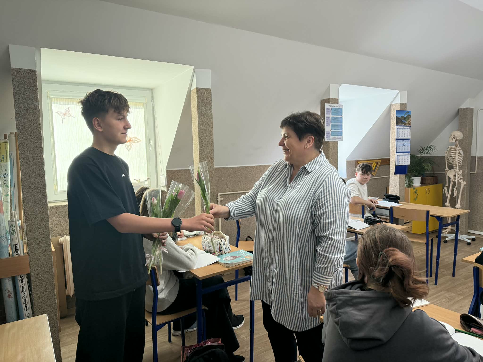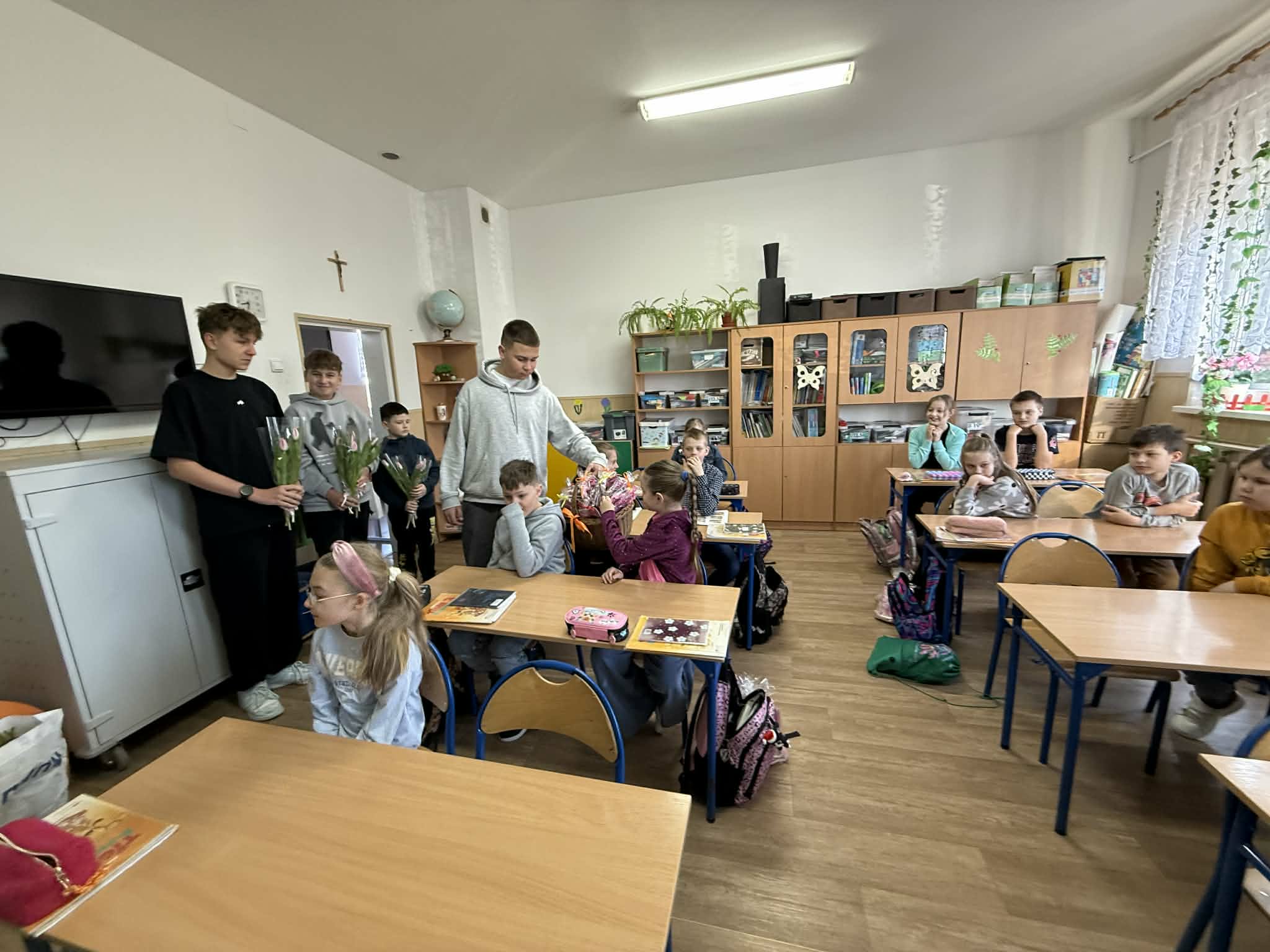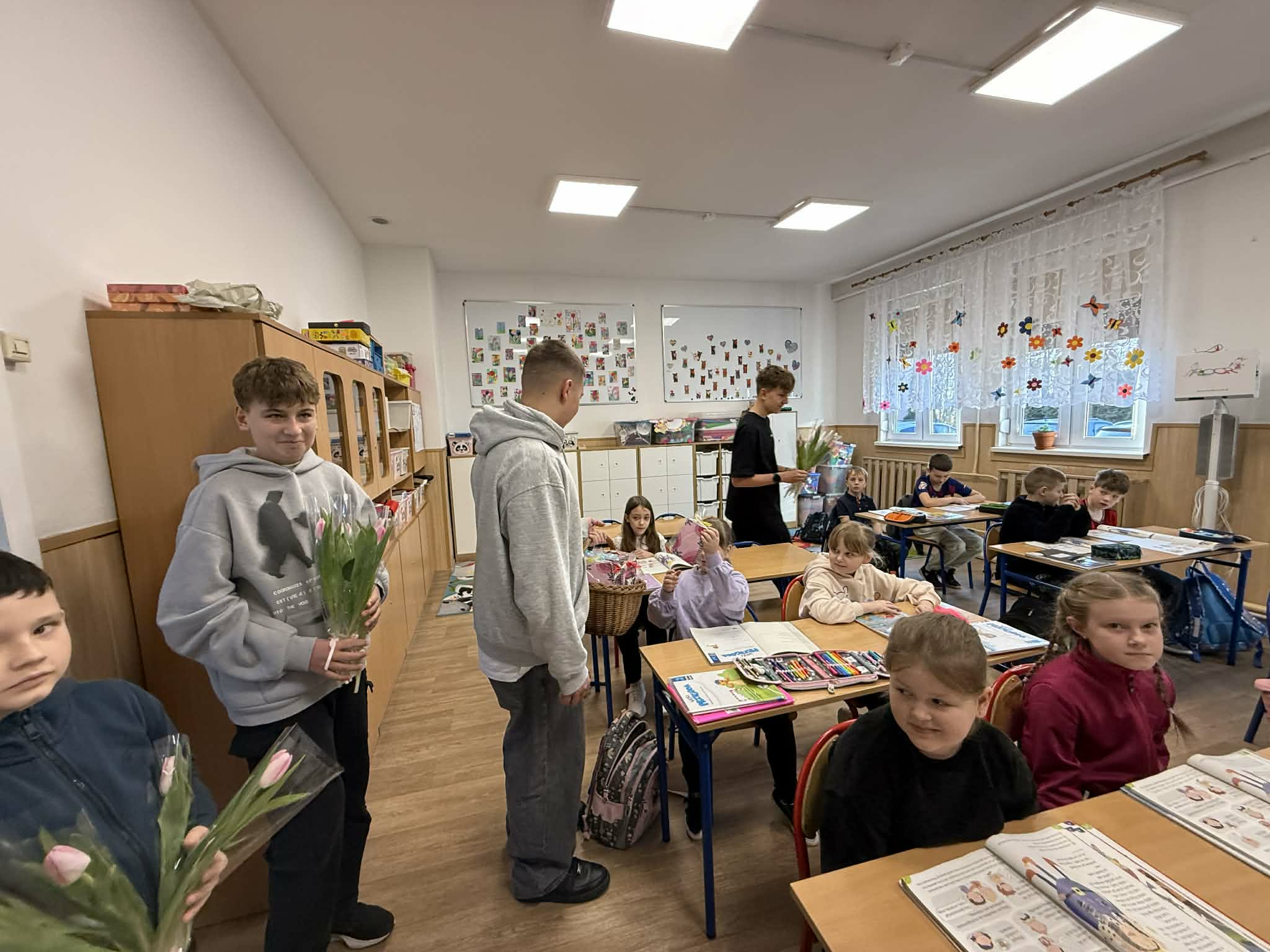 8 marca w naszej szkole obchodziliśmy Dzień Kobiet, który z ogromnym zaangażowaniem przygotowali chłopcy z Samorządu Uczniowskiego. Już od rana w szkolnych korytarzach panowała wyjątkowo miła i radosna atmosfera. Chłopcy zadbali o to, by każda kobieta; zarówno uczennica, jak i nauczycielka poczuła się w tym dniu wyjątkowo. Nauczycielki i pracownice szkoły otrzymały piękne, kolorowe tulipany, które wywołały wiele uśmiechów i wzruszeń. Dziewczynki zostały obdarowane upominkami: uroczymi notesikami "cudownej dziewczyny" oraz okolicznościowymi długopisami. Na wszystkich czekał również pyszny poczęstunek - świeży popcorn i słodkie, domowe babeczki. Był to dzień pełen życzliwości, radości i miłych gestów, które na długo pozostaną w pamięci. Serdecznie dziękujemy chłopcom z Samorządu Uczniowskiego za ich pomysłowość, kulturę i wspaniałe przygotowanie tego wyjątkowego święta!