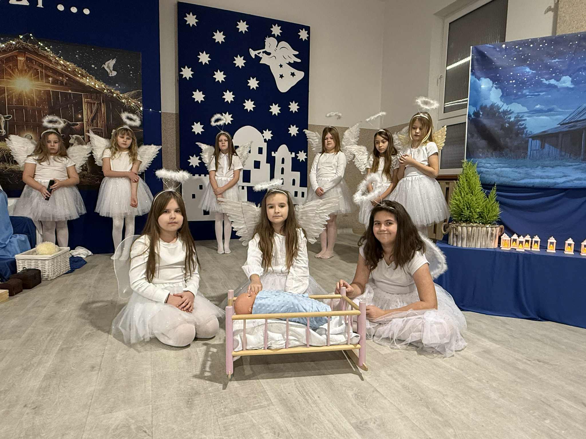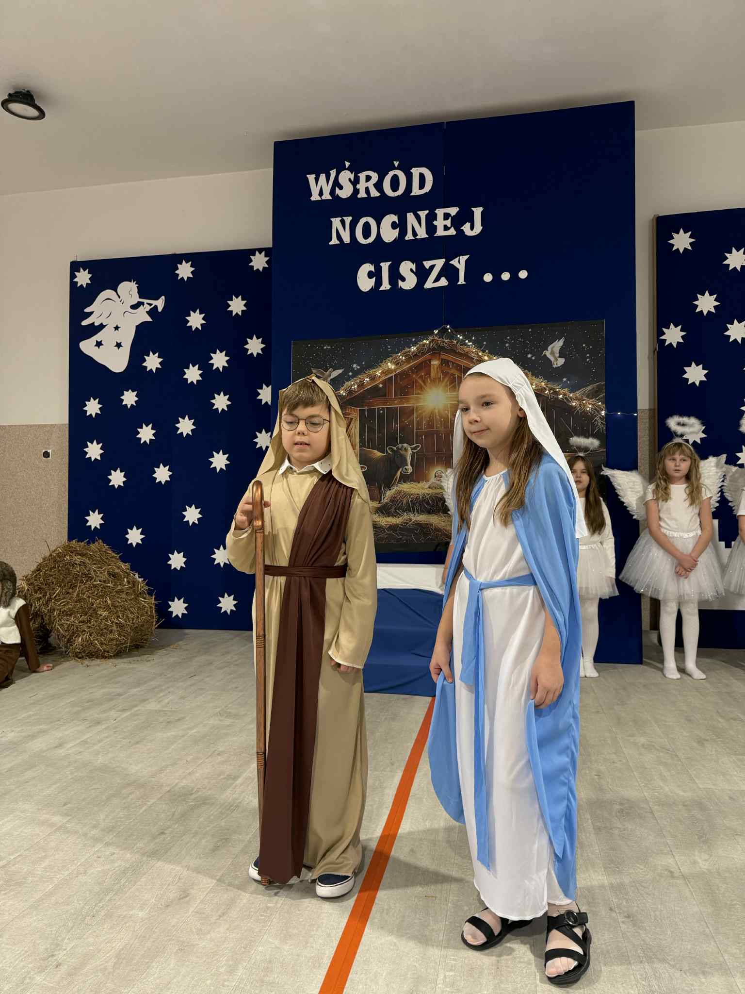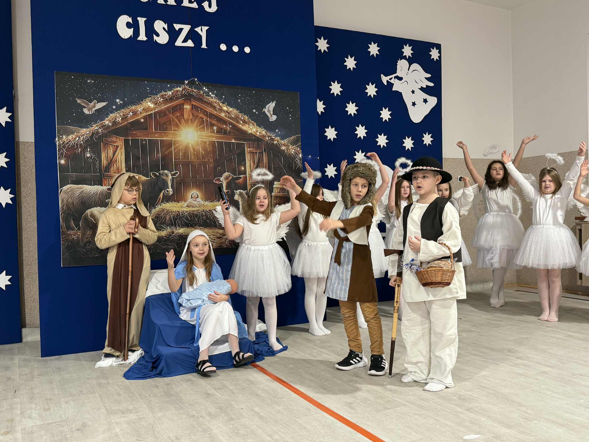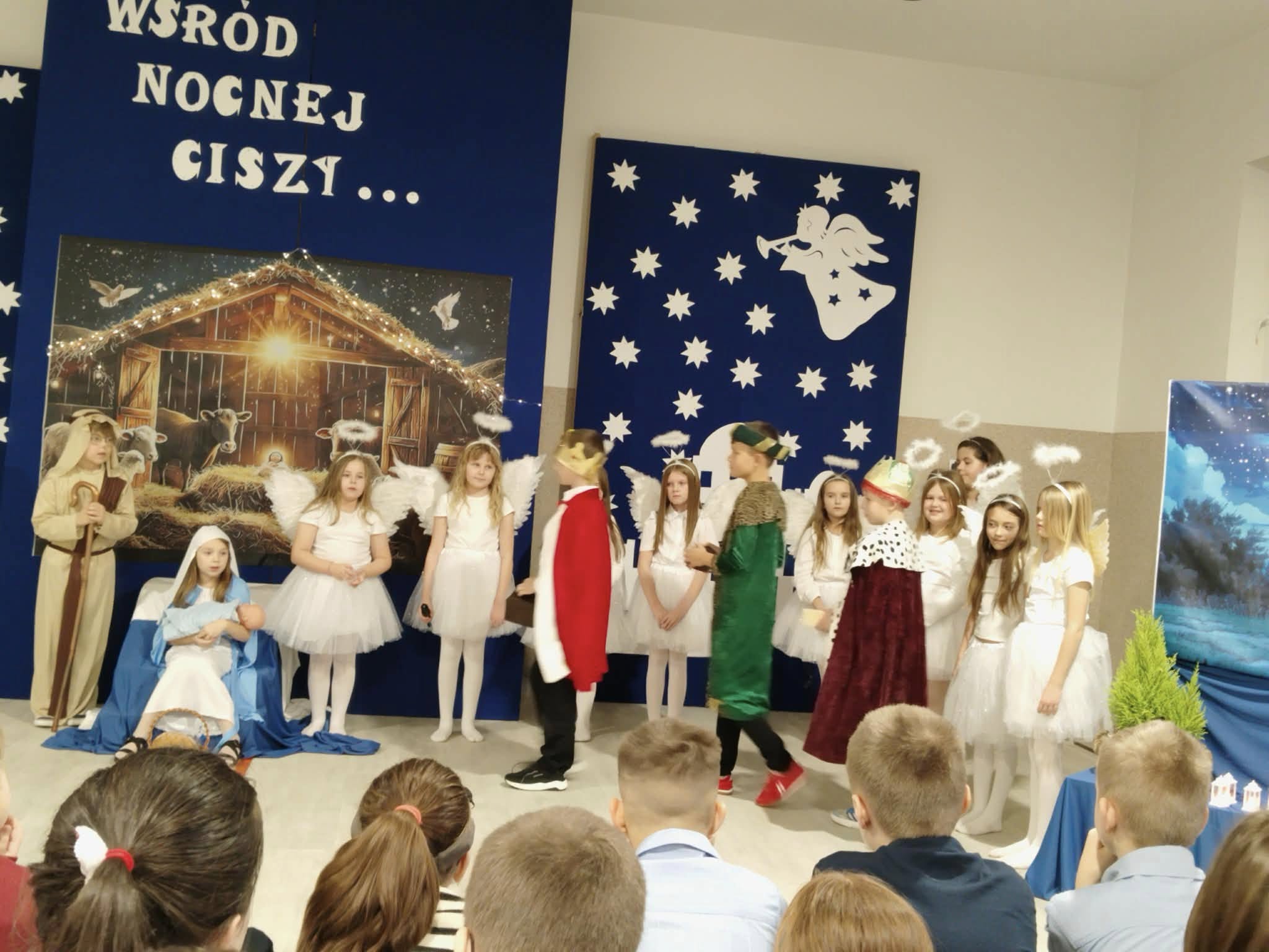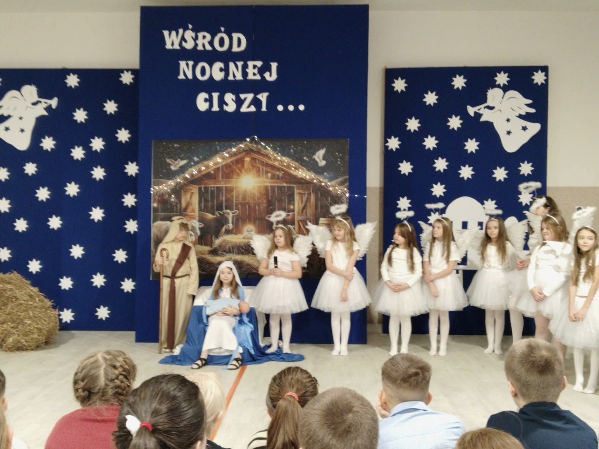 Uroczystość rozpoczęła Pani Dyrektor, która serdecznie powitała wszystkich zgromadzonych, wprowadzając uczestników w ciepłą, świąteczną atmosferę. Następnie uczniowie klasy II zaprezentowali przygotowane Jasełka przygotowane przez panie - Karolinę Czerczak i Katarzynę Gonciarz oraz Agnieszkę Polus. Widowisko było pełne wzruszeń, radości i bożonarodzeniowej refleksji.